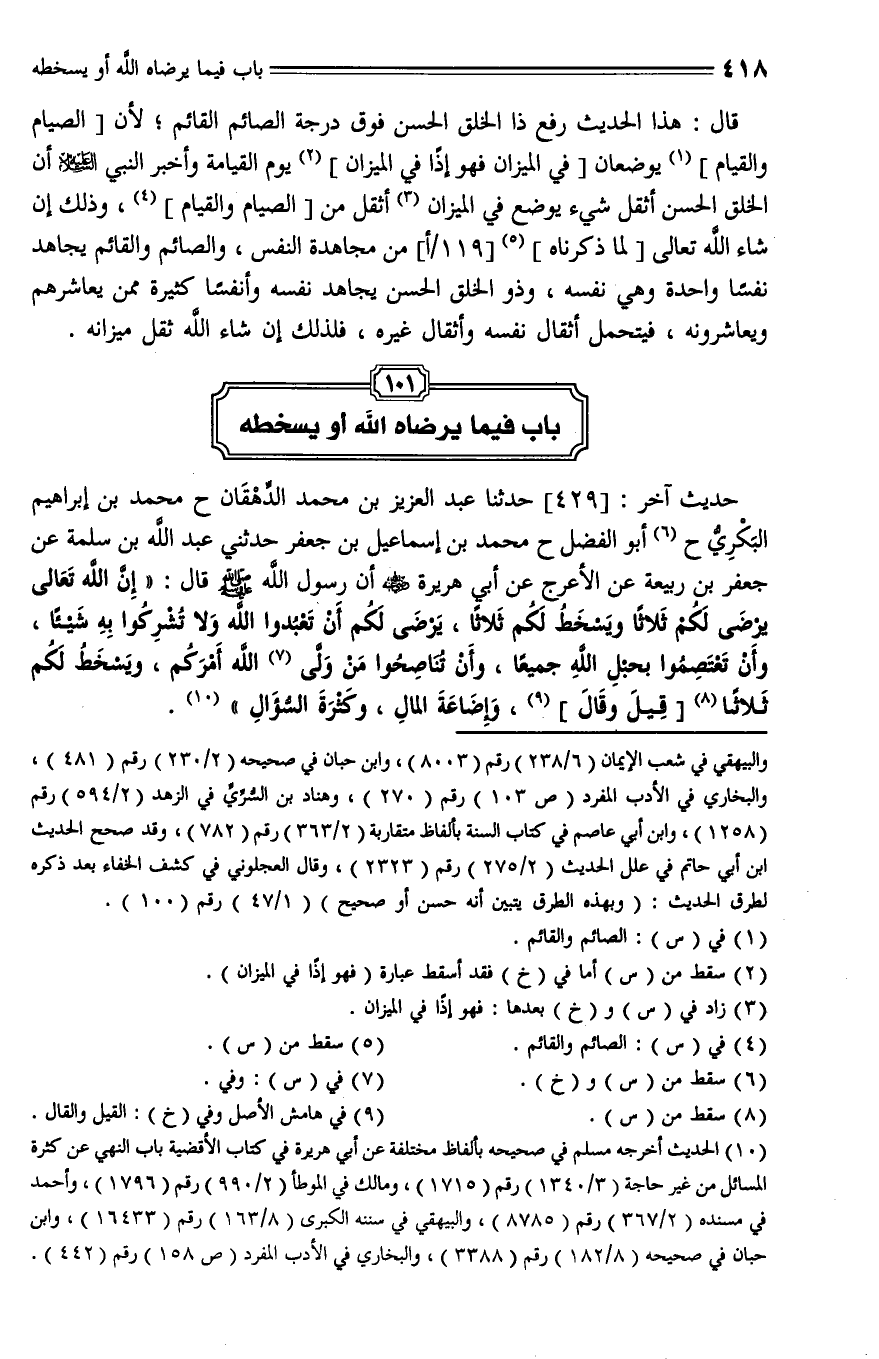 429 - حدثنا عَبْدُ الْعَزِيزِ بْنُ مُحَمَّدِ الدِّهْقَانِ، حَدَّثَنَا مُحَمَّدُ بْنُ إِبْرَاهِيمَ الْبَكْرِيُّ أَبُو الْفَضْلِ، حَدَّثَنَا مُحَمَّدُ بْنُ إِسْمَاعِيلَ بْنِ جَعْفَرٍ أبو جعفر , حَدَّثَنِي عَبْدُ اللَّهِ بْنُ سَلَمَةَ , عَنْ جَعْفَرِ بْنِ رَبِيعَةَ , عَنِ الْأَعْرَجِ , عَنْ أَبِي هُرَيْرَةَ - رضي الله عنه - أَنَّ رَسُولَ اللَّهِ صلى الله عليه وسلم، قال: " إِنَّ اللَّهَ تَعَالَى يَرْضَى لَكُمْ ثَلَاثًا وَيَسْخَطُ لَكُمْ ثَلَاثًا , يَرْضَى لَكُمْ: أَنْ تَعْبُدُوا اللَّهَ وَلَا تُشْرِكُوا بِهِ شَيْئًا , وَأَنْ تَعْتَصِمُوا بِحَبْلِ اللَّهِ جَمِيعًا , وَأَنْ تُنَاصِحُوا مَنْ وَلَّى اللَّهُ أَمْرَكُمْ , وَيَسْخَطُ لَكُمْ ثلاثا: القِيلَ وَالقَالَ , وَإِضَاعَةَ الْمَالِ , وَكَثْرَةَ السُّؤَالِ ".