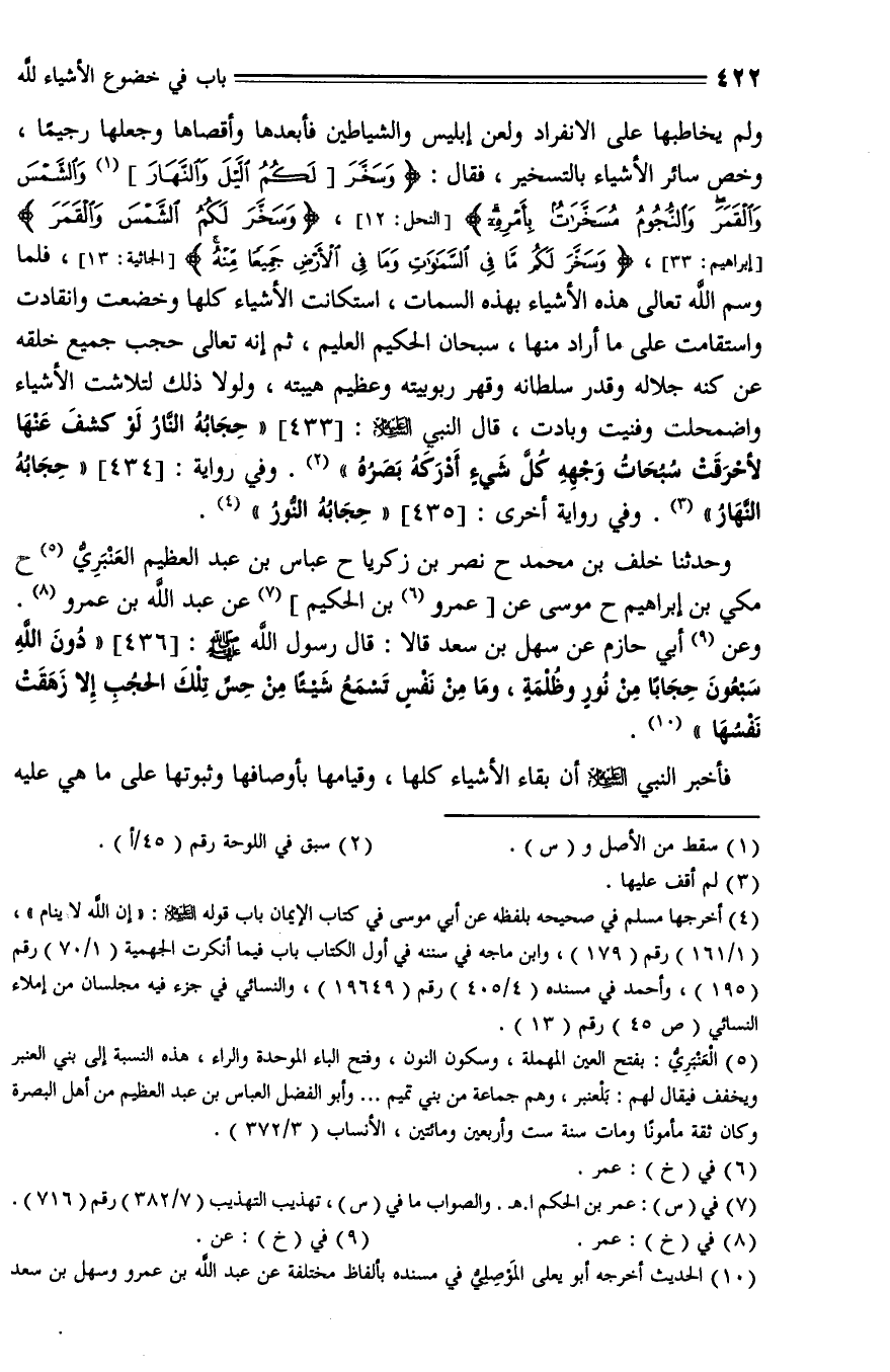 436 - وَحَدَّثَنَا خَلَفُ بْنُ مُحَمَّدٍ، حَدَّثَنَا نَصْرُ بْنُ زَكَرِيَّا، حَدَّثَنَا عَبَّاسُ بْنُ عَبْدِ الْعَظِيمِ الْعَنْبَرِيُّ، حَدَّثَنَا مَكِّيُّ بْنُ إِبْرَاهِيمَ، حَدَّثَنَا مُوسَى , عَنْ عُمَرَ بْنِ الْحَكَمِ , عَنْ عَبْدِ اللَّهِ بْنِ عمرو , وَعَنْ أَبِي حَازِمٍ , عَنْ سَهْلِ بْنِ سَعْدٍ , قَالَا: قال رَسُولُ اللَّهِ صلى الله عليه وسلم: " دُونَ اللَّهِ سَبْعُونَ حِجَابًا مِنْ نُورٍ وَظُلْمَةٍ , وَمَا مِنْ نَفْسٍ تَسْمَعُ شَيْئًا مِنْ حُسْنِ تِلْكَ الْحُجُبِ إِلَّا زَهَقَتْ نَفْسُهَا ".