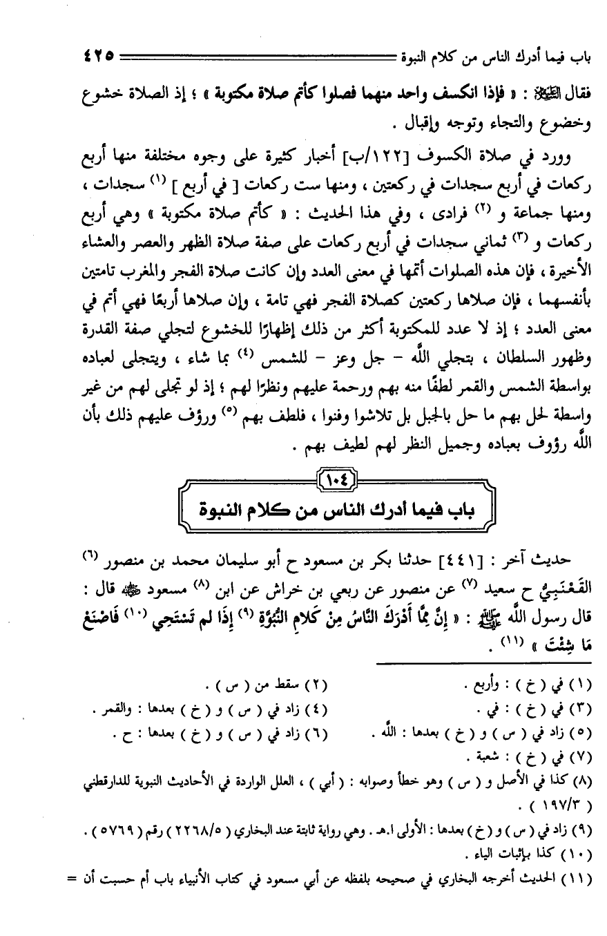 441 - حَدَّثَنَا بَكْرُ بْنُ مَسْعُودٍ، حَدَّثَنَا أَبُو سُلَيْمَانَ مُحَمَّدُ بْنُ مَنْصُورٍ، حدثنا الْقَعْنَبِيُّ، حَدَّثَنَا شعبة (1) , عَنْ مَنْصُورٍ , عَنْ رِبْعِيِّ بْنِ حِرَاشٍ , عَنِ أبي (2) مَسْعُودٍ , رَضِيَ اللَّهُ عَنْهُ، قَالَ: قال رَسُولُ اللَّهِ صلى الله عليه وسلم: " إِنَّ مِمَّا أَدْرَكَ النَّاسُ مِنْ كَلَامِ النُّبُوَّةِ الْأُولَى إِذَا لَمْ تَسْتَحِ فَاصْنَعْ مَا شِئْتَ ".