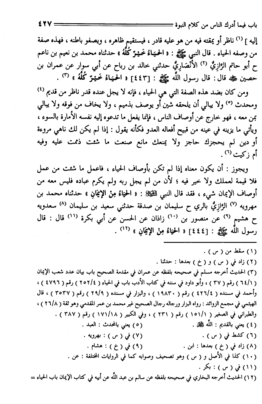 444 - حَدَّثَنَاهُ مُحَمَّدُ بْنُ مَهْرَوَيْهِ الرَّازِيُّ - بِالرَّيِّ - حَدَّثَنَا سُلَيْمَانُ بْنُ صَدَقَةَ , حَدَّثَنِي سَعِيدُ بْنُ سُلَيْمَانَ بْنِ سَعْدَوَيْهِ، حَدَّثَنَا هُشَيْمٌ, عَنْ مَنْصُورِ بْنِ زَاذَانَ , عَنِ الْحَسَنِ , عَنْ أَبِي بَكْرة , قال: قَالَ رَسُولُ اللَّهِ صلى الله عليه وسلم: " الْحَيَاءُ مِنَ الْإِيمَانِ ".
