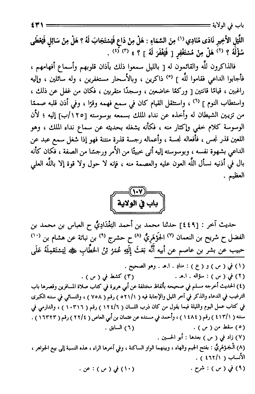 449 - حَدَّثَنَا مُحَمَّدُ بْنُ أَحْمَدَ الْبَغْدَادِيُّ، حَدَّثَنَا الْعَبَّاسُ بْنُ مُحَمَّدِ بْنِ الْفَضْلِ، حَدَّثَنَا سُرَيْجُ بْنُ النُّعْمَانِ أبو الحسن الْجَوْهَرِيُّ، حَدَّثَنَا حَشْرَجُ بْنُ نُبَاتَةَ , عَنْ هِشَامٍ بن حَبِيبٍ , عَنْ بِشْرِ بْنِ عَاصِمٍ , عَنْ أَبِيهِ , أَنَّهُ بَعَثَ إِلَيْهِ عُمَرُ بْنُ الْخَطَّابِ رَضِيَ اللَّهُ عَنْهُ لِيَسْتَعْمِلَهُ عَلَى بَعْضِ الصَّدَقَةِ , فَأَبَى أَنْ يَعْمَلَ لَهُ , وقال: سَمِعْتُ النبي عليه السلام يَقُولُ: " إِذَا كَانَ يَوْمُ الْقِيَامَةِ أُتِيَ بِالْوَالِي فَيُقْذَفُ عَلَى جِسْرِ جَهَنَّمَ , فَيَأْمُرُ اللَّهُ تَعَالَى بها فَيَنْتَفِضُ به انْتِفَاضَةً يَزُولُ كُلُّ عَظْمٍ عَنْ مَكَانِهِ , ثُمَّ يَأْمُرُ اللَّهُ الْعِظَامَ فَتَرْجِعُ إِلَى أَمَاكِنِهَا , ثُمَّ يَسْائلُهُ فَإِنْ كَانَ لِلَّهِ مُطِيعًا أَخَذَ بِيَدِهِ وَأَعْطَاهُ كِفْلَيْنِ مِنْ رَحْمَتِهِ , وَإِنْ كَانَ لِلَّهِ عَاصِيًا خَرَقَ بِهِ الْجِسْرَ , فَهَوَى فِي جَهَنَّمَ مِقْدَارَ سَبْعِينَ خَرِيفًا " (ق133أ). فَقَالَ عُمَرُ رضي الله عنه: سَمِعْتَ مِنْ رَسُولِ اللَّهِ عليه السلام مَا لَمْ أَسْمَعْ؟ قال: نَعَمْ , قال: فَكَانَ هُنَاكَ سَلْمَانُ الْفَارِسِيُّ , وَأَبُو ذَرٍّ الْغِفَارِيُّ , فَقَالَ سَلْمَانُ: إِي وَاللَّهِ يَا عُمَرُ بْنَ الْخَطَّابِ , " وَمَعَ السَّبْعِينَ سبعين خَرِيفًا فِي وَادي مِنْ نَارٍ تَلْتَهِبُ الْتِهَابًا ". فَقَالَ عمر بِيَدِهِ عَلَى جَبْهَتِهِ: إِنَّا لِلَّهِ وَإِنَّا إِلَيْهِ رَاجِعُونَ , مَنْ يَأْخُذُهَا بِمَا فِيهَا؟ فَقَالَ سَلْمَانُ: مَنْ سَلَتَ اللَّهُ أَنْفَهُ بِالتُّرَابِ, وَأَلْصَقَ خَدَّهُ بالأرض.