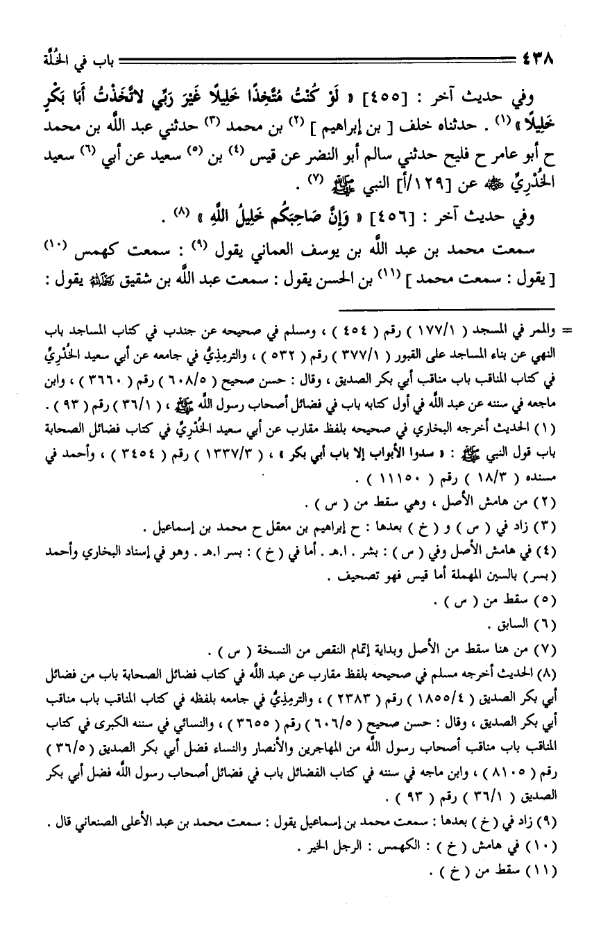 455 - وَفِي حديث آخر: " لَوْ كُنْتُ مُتَّخِذًا خَلِيلًا غَيْرَ رَبِّي لَاتَّخَذْتُ أَبَا بَكْرِ خَلِيلًا ". حَدَّثَنَاه خَلَفُ بنُ إبراهيم بْنُ مُحَمَّدٍ، حَدَّثَنَا إِبْرَاهِيمُ بْنُ مَعْقِلٍ، حَدَّثَنَا مُحَمَّدُ بْنُ إِسْمَاعِيلَ , حَدَّثَنِي عَبْدُ اللَّهِ بْنُ مُحَمَّدٍ، حَدَّثَنَا أَبُو عَامِرٍ، حَدَّثَنَا فُلَيْحٌ , حَدَّثَنِي سَالِمٌ أَبُو النَّضْرِ , عَنْ بُسْرِ بْنِ سَعِيدٍ , عَنْ أَبِي سَعِيدٍ الْخُدْرِيِّ، رضي الله عنه , عَنِ النَّبِيِّ صَلَّى اللَّهُ عَلَيْهِ وَسَلَّمَ.