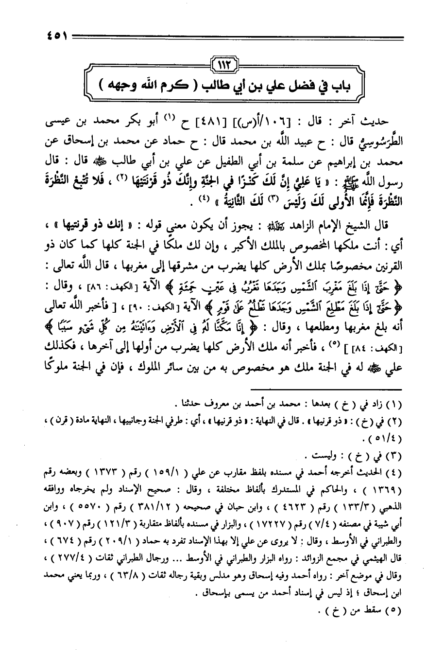 481 - حدثنا محمد بن أحمد بن معروف، حَدَّثَنا أَبُو بَكْرٍ مُحَمَّدُ بْنُ عِيسَى الطَّرَسُوسِيُّ، حَدَّثَنا عُبَيْدُ اللَّهِ بْنُ مُحَمَّدٍ، حَدَّثَنا حَمَّادٌ , عَنْ مُحَمَّدِ بْنِ إِسْحَاقَ , عَنْ مُحَمَّدِ بْنِ إِبْرَاهِيمَ , عَنْ سَلَمَةَ بْنِ أَبِي الطُّفَيْلِ , عَنْ عَلِيِّ بن أبي طالب - رَضِيَ اللَّهُ عَنْهُ - قَالَ: قال رَسُولُ اللَّهِ صلى الله عليه وسلم لعلي: " يَا عَلِيُّ إِنَّ لَكَ كَنْزًا فِي الْجَنَّةِ , وَإِنَّكَ ذُو قَرْنَيْهَا , فَلَا تُتْبِعِ النَّظْرَةَ النَّظْرَةَ , فَإِنَّمَا الْأُولَى لَكَ وَلَيْسَ لَكَ الثَّانِيَةُ ".
