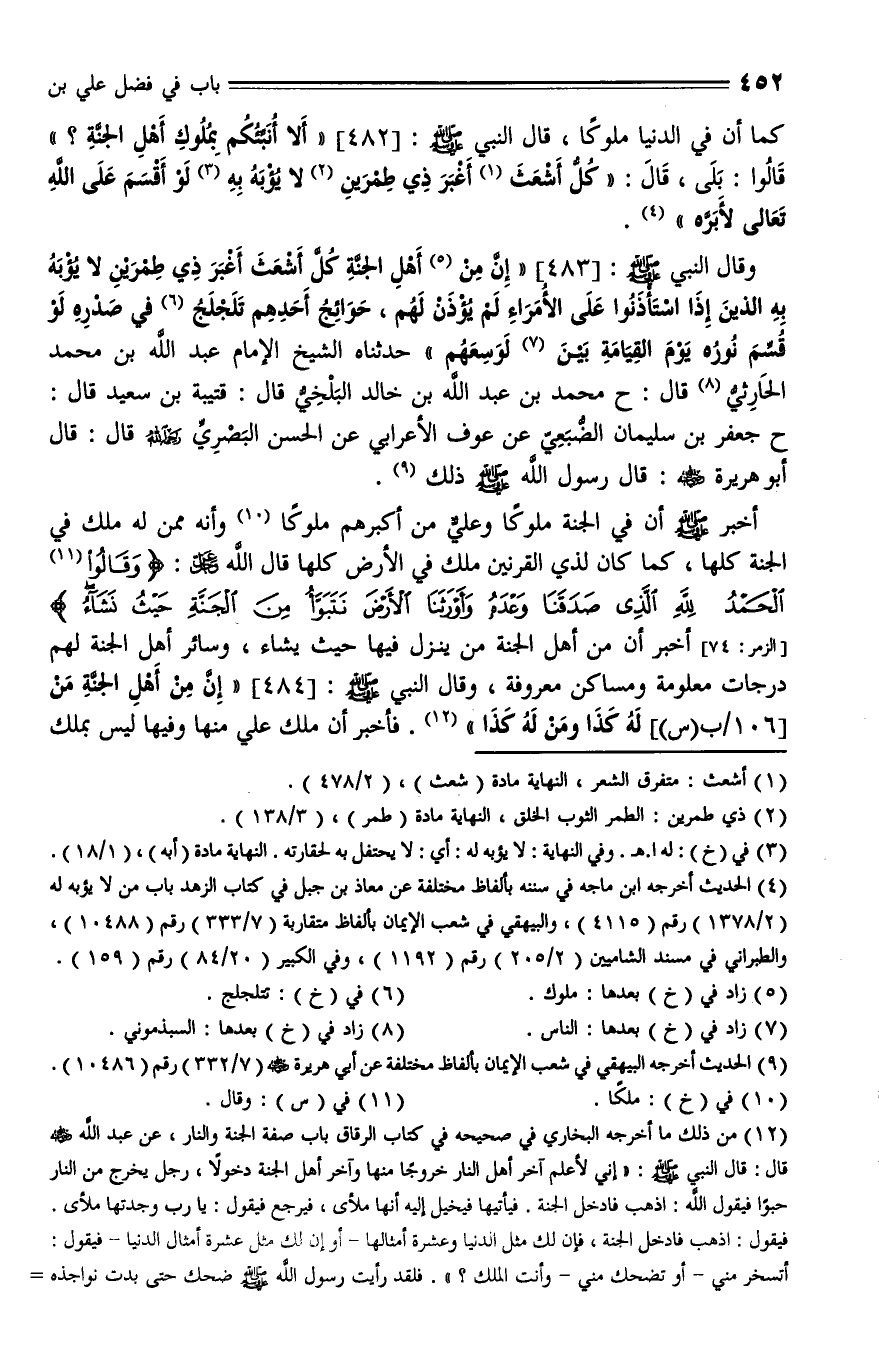 483 - وَقَالَ النَّبِيُّ - صلى الله عليه وسلم -: " إن من ِ (1) أَهْلِ الْجَنَّةِ، كُلَّ أَشْعَثَ أَغْبَرَ ذِي طِمْرَيْنِ , لَا يُؤْبَهُ به , الَّذِينَ إِذَا اسْتَأْذَنُوا عَلَى الْأُمَرَاءِ لَمْ يُؤْذَنْ لَهُمْ , حَوَائِجُ أَحَدِهِمْ تَلَجْلَجُ (2) فِي صَدْرِهِ , لَوْ قُسِّمَ نُورُهُ يَوْمَ الْقِيَامَةِ بَيْنَ الناس لَوَسِعَهُمْ ".