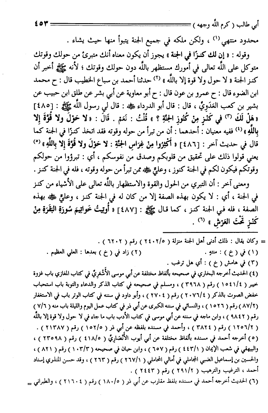 485 - حَدَّثَنَا أَحْمَدُ بْنُ سِبَاعٍ الْخَطِيبُ , حَدَّثَنا مُحَمَّدُ بْنُ الضوء، حَدَّثَنا عَمْرُو بْنُ عَوْنٍ، حَدَّثَنا أَبُو مُعَاوِيَةَ , عَنْ أَبِي بِشْرٍ , عَنْ طَلْقِ بْنِ حَبِيبٍ , عَنْ بَشِيرِ بْنِ كَعْبٍ الْعَدَوِيِّ قال: قَالَ أَبُو الدرداء - رَضِيَ اللَّهُ عَنْهُ -: قَالَ لِي رَسُولُ اللَّهِ صلى الله عليه وسلم: " هَلْ لَكَ فِي كَنْزٍ مِنْ كُنُوزِ الْجَنَّةِ؟ قُلْتُ: نَعَمْ , قال: لَا حَوْلَ وَلَا قُوَّةَ إِلَّا بِاللَّهِ ".