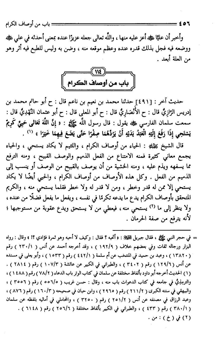 491 - حَدَّثَنَا مُحَمَّدُ بْنُ نُعَيْمِ بْنِ نَاعِمٍ , قال: حَدَّثَنا أَبُو حَاتِمٍ مُحَمَّدُ بْنُ إِدْرِيسَ الرَّازِيُّ، قال: حَدَّثَنا الْأَنْصَارِيُّ، قال: حَدَّثَنا أَبُو الْمُعَلَّى، قال: حَدَّثَنا أَبُو عُثْمَانَ النَّهْدِيُّ، قال: سَمِعْتُ سَلْمَانَ (ق143ب) الْفَارِسِيَّ - رَضِيَ اللَّهُ عَنْهُ - يَقُولُ: قَالَ رَسُولُ اللَّهِ صلى الله عليه وسلم: " إِنَّ اللَّهَ تَعَالَى حيي كَرِيمٌ يَسْتَحْيِي إِذَا رَفَعَ إِلَيْهِ الْعَبْدُ يَدَيْهِ أَنْ يَرُدَّهُمَا صِفْرًا حَتَّى يَضَعَ فِيهِمَا خَيْرًا ".