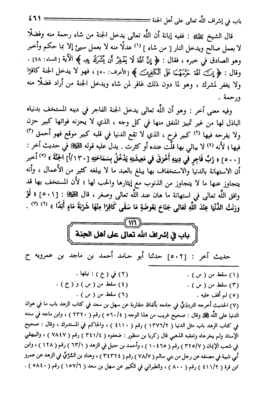 502 - حدثنا أَبُو حَامِدٍ أَحْمَدُ بْنُ مَاجِدِ بْنِ عَمْرَوَيْهِ، حَدَّثَنا أَبُو عَبْدِ الرَّحِيمِ عَبْدِ الرَّحْمَنِ بْنِ إِبْرَاهِيمَ بْنِ يُوسُفَ، حَدَّثَنا أَحْمَدُ بْنُ عِيسَى الْمِصْرِيُّ، حَدَّثَنا أَبُو عَاصِمٍ الْعَبَّادَانِيُّ , عَنِ الْفَضْلِ الرَّقَاشِيِّ , عَنْ مُحَمَّدِ بْنِ الْمُنْكَدِرِ , عَنْ جَابِرِ بْنِ عَبْدِ اللَّهِ الأنصاري , رَضِيَ اللَّهُ عَنْهُ، أَنَّ النبي صلى اللَّهِ عليه وسلم، قال: " بَيْنَا أَهْلُ الْجَنَّةِ فِي نَعِيمِهِمْ إِذْ سَطَعَ لَهُمْ نُورٌ مِنْ فَوْقِهِمْ فَإِذَا الرَّبُّ تعالى قَدْ أَشْرَفَ عَلَيْهِمْ , فَقال: السَّلَامُ عَلَيْكُمْ يَا أَهْلَ الْجَنَّةِ، وَذَلِكَ قَوْلُهُ يعني: {سَلَامٌ قَوْلًا مِنْ رَبٍّ رَحِيمٍ} , قال: فَإِذَا نَظَرُوا إِلَيْهِ نَسَوْا نَعِيمَ الْجَنَّةِ حَتَّى يَحْتَجِبَ عَنْهُمْ , فَإِذَا احْتَجَبَ عَنْهُمْ بَقَى نُورُهُ وَبَرَكَتُهُ عَلَيْهِمْ وَفِي دِيَارِهِمْ ".
