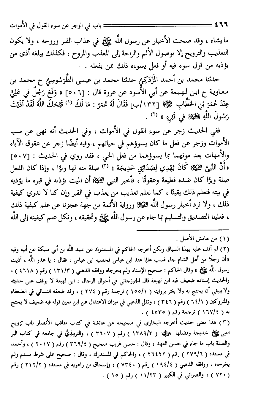 506 - حَدَّثَنَا مُحَمَّدُ بْنُ أَحْمَدَ الْمَردكِيُّ , حَدَّثَنا مُحَمَّدُ بْنُ عِيسَى الطَّرَسُوسِيُّ، حَدَّثَنا مُحَمَّدُ بْنُ مُعَاوِيَةَ، حَدَّثَنا ابْنُ لَهِيعَةَ , عَنْ أَبِي الْأَسْوَدِ , عَنْ عُرْوَةَ , قال: " وَقَعَ رَجُلٌ فِي عَلِيٍّ عِنْدَ عُمَرَ بْنِ الْخَطَّابِ - رضي الله عنه - فَقَالَ لَهُ عُمَرُ: مَا لَكَ قَبَّحَكَ اللَّهُ لَقَدْ آذَيْتَ رَسُولَ اللَّهِ عليه السلام فِي قَبْرِهِ ".