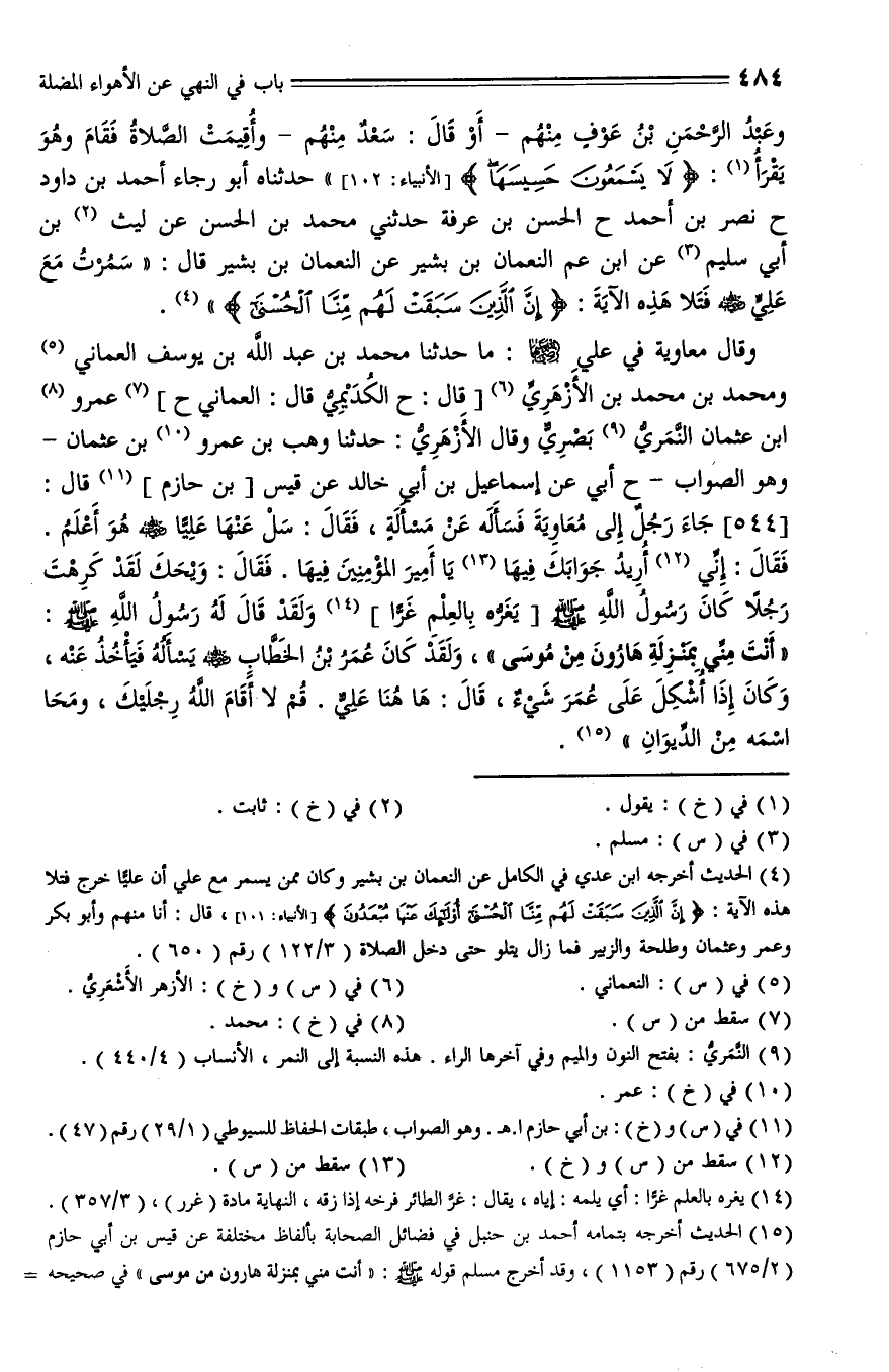 544 - مَا حَدَّثَنَا مُحَمَّدُ بْنُ عَبْدِ اللَّهِ بْنِ يُوسُفَ العُمانِيُّ (1) , وَمُحَمَّدُ بْنُ مُحَمَّدِ بْنِ الأزهري (2) , قالا: حدثنا الكديمي، قال العماني: ثنا عَمْرِو بْنِ عُثْمَانَ النَّمَريِّ , بَصَرِيٌّ , وَقال الْأَزْهَرِيُّ: حَدَّثَنَا وَهْبُ بْنُ عَمْرِو بْنِ عُثْمَانَ , وَهُوَ الصَّوَابُ، حَدَّثَنا أَبِي , عَنْ إِسْمَاعِيلَ بْنِ أَبِي خَالِدٍ , عَنْ قَيْسِ بْنِ أَبِي حَازِمٍ , قال: " جَاءَ رَجُلٌ إِلَى مُعَاوِيَةَ، فَسَأَلَهُ عَنْ مَسْأَلَةٍ , فَقال: سَلْ عَنْهَا عَلِيّاً رَضِيَ اللَّهُ عَنْهُ هُوَ أَعْلَمُ , فَقال: أُرِيدُ جَوَابَكَ فِيهَا يَا أَمِيرَ الْمُؤْمِنِينَ , فقال: " وَيْحَكَ، لَقَدْ كَرِهْتَ رَجُلًا كَانَ رَسُولُ اللَّهِ - صلى الله عليه وسلم - يَغَرُّه بِالْعِلْمِ غرًّا " , وَلَقَدْ قَالَ له رَسُولُ اللَّهِ - صلى الله عليه وسلم -: " أَنْتَ مِنِّي بِمَنْزِلَةِ هَارُونَ مِنْ مُوسَى ". وَلَقَدْ كَانَ عُمَرُ بْنُ الْخَطَّابِ - رضي الله عنه - يَسْأَلُهُ فَيَأْخُذُ عَنْهُ , وَكَانَ إِذَا أُشْكِلَ عَلَى عُمَرَ شَيْءٌ، قال: هَاهُنَا عَلِيٌّ , قُمْ لَا أَقَامَ اللَّهُ رِجْلَيْكَ وَمَحَا اسْمَهُ مِنَ الدِّيوَانِ ".