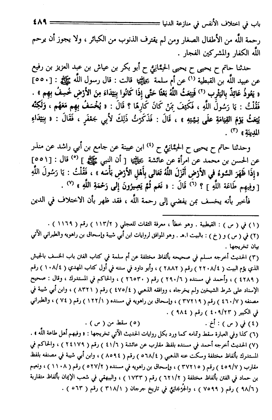 550 - حَدَّثَنَا حَاتِمٌ , حَدَّثَنا يَحْيَى، حَدَّثَنا (ق158أ) الحماني، حَدَّثَنا أَبُو بَكْرِ بْنُ عَيَّاشٍ , عَنْ عَبْدِ الْعَزِيزِ بْنِ رُفَيْعٍ , عَنْ عُبَيْدِ اللَّهِ ابْنِ الْقِبْطِيَّةِ , عَنْ أُمِّ سَلَمَةَ رَضِيَ اللَّهُ عَنْهَا قَالَتْ: قَالَ رَسُولُ اللَّهِ - صلى الله عليه وسلم -: " يَعُوذُ عَائِذٌ بِالْبَيْتِ فَيَبْعَثُ اللَّهُ بَعْثًا، حَتَّى إِذَا كَانُوا بِبَيْدَاءَ مِنَ الْأَرْضِ خُسِفَ بِهِمْ "، فَقُلْتُ: يَا رَسُولَ اللَّهِ فَكَيْفَ بِمَنْ كَانَ كَارِهًا؟ قال: " يُخْسَفُ بِهِمْ مَعَهُمْ , وَلَكِنَّهُ يُبْعَثُ يَوْمَ الْقِيَامَةِ عَلَى نِيَّتِهِ "، قال: فَذَكَرْتُ ذَلِكَ لِأَبِي جَعْفَرٍ فَقال: " ببَيْدَاءُ الْمَدِينَةِ ".