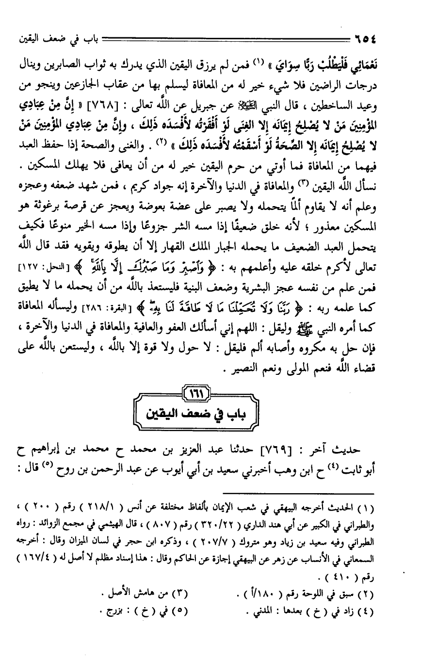769 - حدثنا عبد العزيز بن محمد، حدثنا محمد بن إبراهيم، حدثنا أبو ثابت، حدثنا ابن وهب، أخبرني سعيد بن أبي أيوب، عن عبد الرحمن بن بزرج (1)، قال: سمعت أبا هريرة - رضي الله عنه - يقول: قال رسول الله - صلى الله عليه وسلم -: " ما أخاف على أمتي إلا ضعف اليقين ".