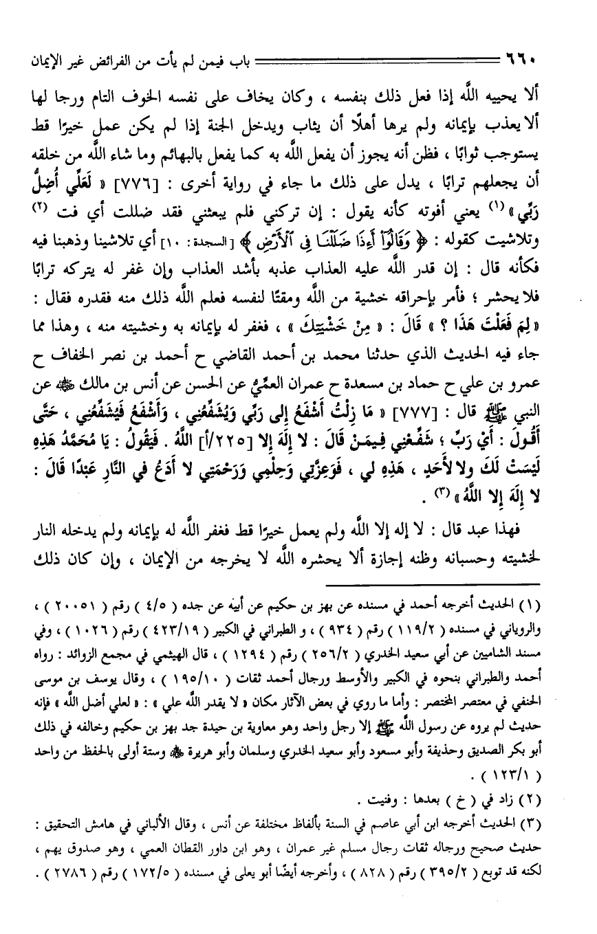 777 - حدثنا محمد بن أحمد القاضي، حدثنا أحمد بن نصر الخفاف، حدثنا عمرو بن علي، حدثنا حماد بن مسعدة، حدثنا عمران العمي، عن الحسن، عن أنس بن مالك، عن النبي - صلى الله عليه وسلم - قال: " ما (ق242أ) زلت أشفع إلى ربي ويشفعني، وأشفع فيشفعني، حتى أقول أي رب شفعني فيمن قال: لا إله إلا الله، فيقول: يا محمد هذه ليست لك ولا لأحد، هذه لي، فوعزتي وحلمي ورحمتي، لا أدع في النار عبداً قال لا إله إلا الله ".