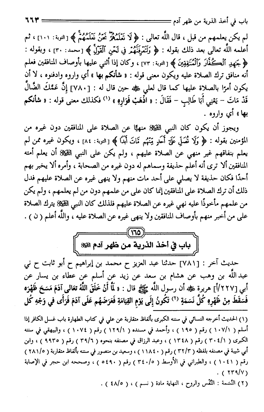781 - حدثنا عبد العزيز، حدثنا محمد بن إبراهيم، حدثنا أبو ثابت، حدثني عبد الله (ق244أ) بن وهب، عن هشام بن سعد، عن زيد بن أسلم، عن عطاء بن يسار، عن أبي هريرة - رضي الله عنه - أن رسول الله - صلى الله عليه وسلم - قال: " لما خلق الله تعالى آدم مسح ظهره فسقط من ظهره كل نسمة تكون إلى يوم القيامة، فعرضهم على آدم فرأى في وجه كل رجل منهم وبيصاً من نور فرأى رجل منهم له وبيص أعجبه، فقال: من هذا يا رب؟ قال: هذا من ولدك اسمه داود، قال: كم عمره (1)؟ قال: ستين سنة، قال: زده من عمري أربعين سنة، قال: إذاً يُكْتَبُ ويُخْتم ولا يبدل، قال: فلما نفد عمر آدم إلا أربعين سنة التي وهبها لداود أتاه ملك الموت، فقال آدمُ: إنه قد بقى من عمري أربعين سنة، قال: ألم تُعطها ابنك داود؟ قال: " فجحد فجحدتْ ذريته، وخَطِئَ فخطِئتْ ذريته، ونسي فنسيت ذريته، فرأى منهم القوي والضعيف، والغني والفقير، والصحيح والمبتلى، فقال: يا رب ألا سويت بينهم؟ قال: أردت أن أُشْكر ".