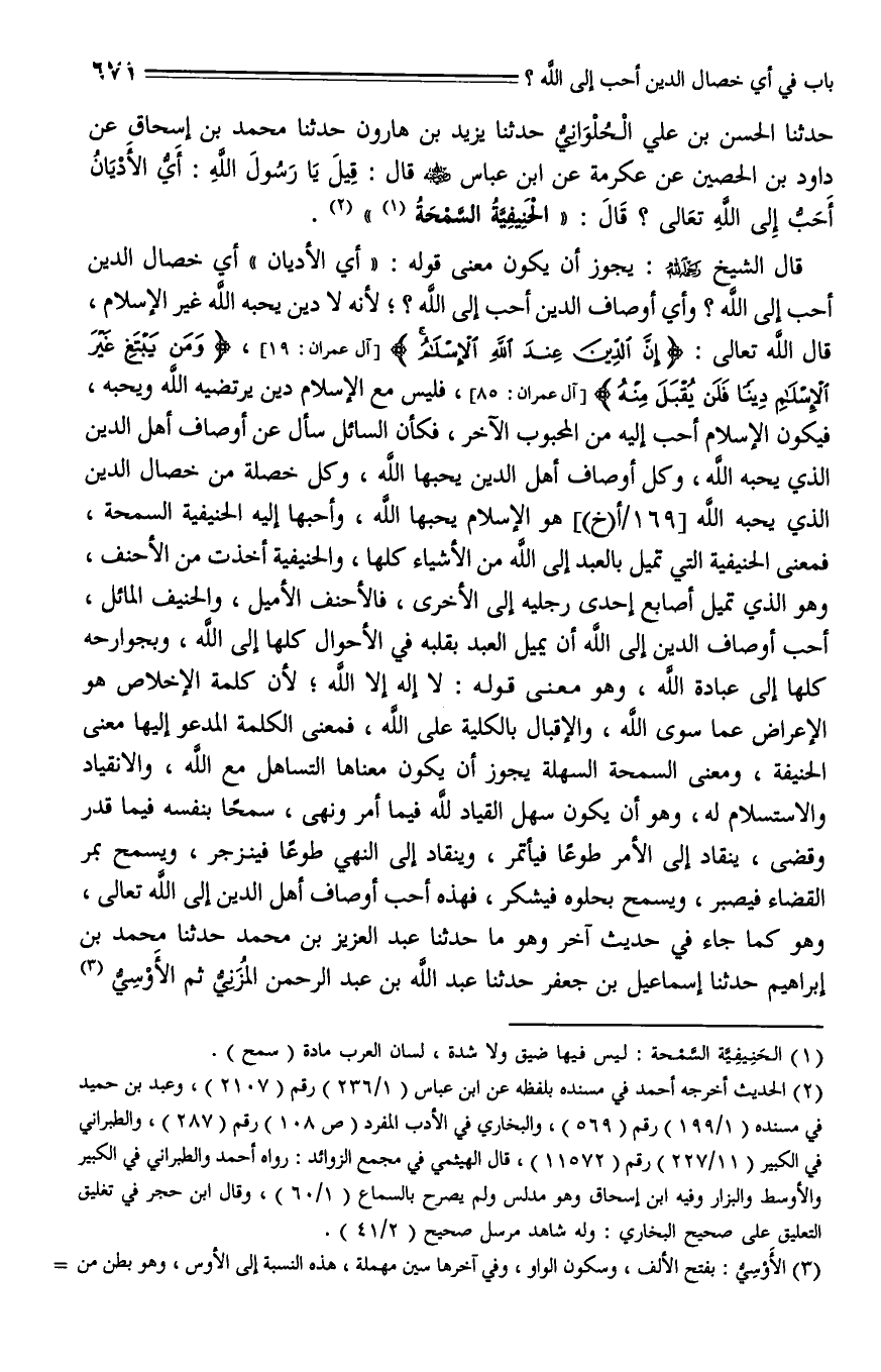 797 - حدثنا عبد العزيز بن محمد، حدثنا محمد بن إبراهيم، حدثنا إسماعيل بن جعفر، حدثنا عبد الله بن عبد الرحمن المزني ثم الأويسي، حدثنا ابن شهاب، عن عبد الله بن عبيد الله بن عمير، عن أبيه عبيد الله بن عمير: " أن رسول الله - صلى الله عليه وسلم - قيل له: ما الإسلام، يا رسول الله؟ قال: " إطعام الطعام، وطيب الكلام ". فقيل له: ما الإيمان يا رسول الله؟ قال: " السماح والصبر ".