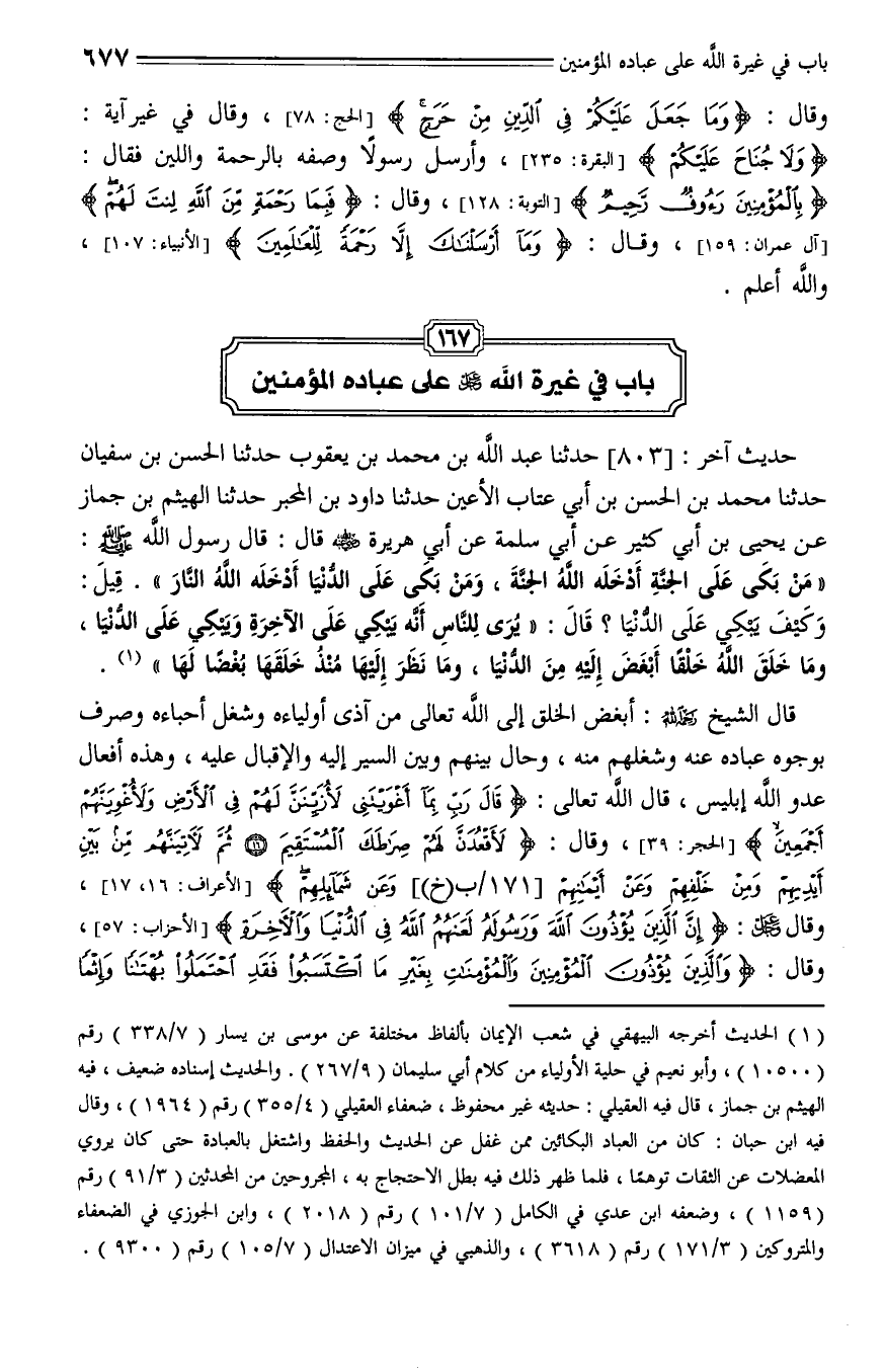 803 - حدثنا عبد الله بن محمد بن يعقوب، حدثنا الحسن بن سفيان، حدثنا محمد بن الحسن بن أبي عتاب الأعين، حدثنا داود بن المحبر، حدثنا الهيثم بن جماز، عن يحيى بن أبي كثير، عن أبي سلمة، عن أبي هريرة - رضي الله عنه - قال: قال رسول الله - صلى الله عليه وسلم -: " من بكى على الجنة، أدخله الله الجنة، ومن بكى على الدنيا، أدخله الله النار" قيل: وكيف يبكي على الدنيا؟ قال: " يرى الناس أنه يبكي على الآخرة ويبكي على الدنيا، وما خلق الله خلقاً أبغض إليه من الدنيا، وما نظر إليها مذ خلقها بغضاً لها ".