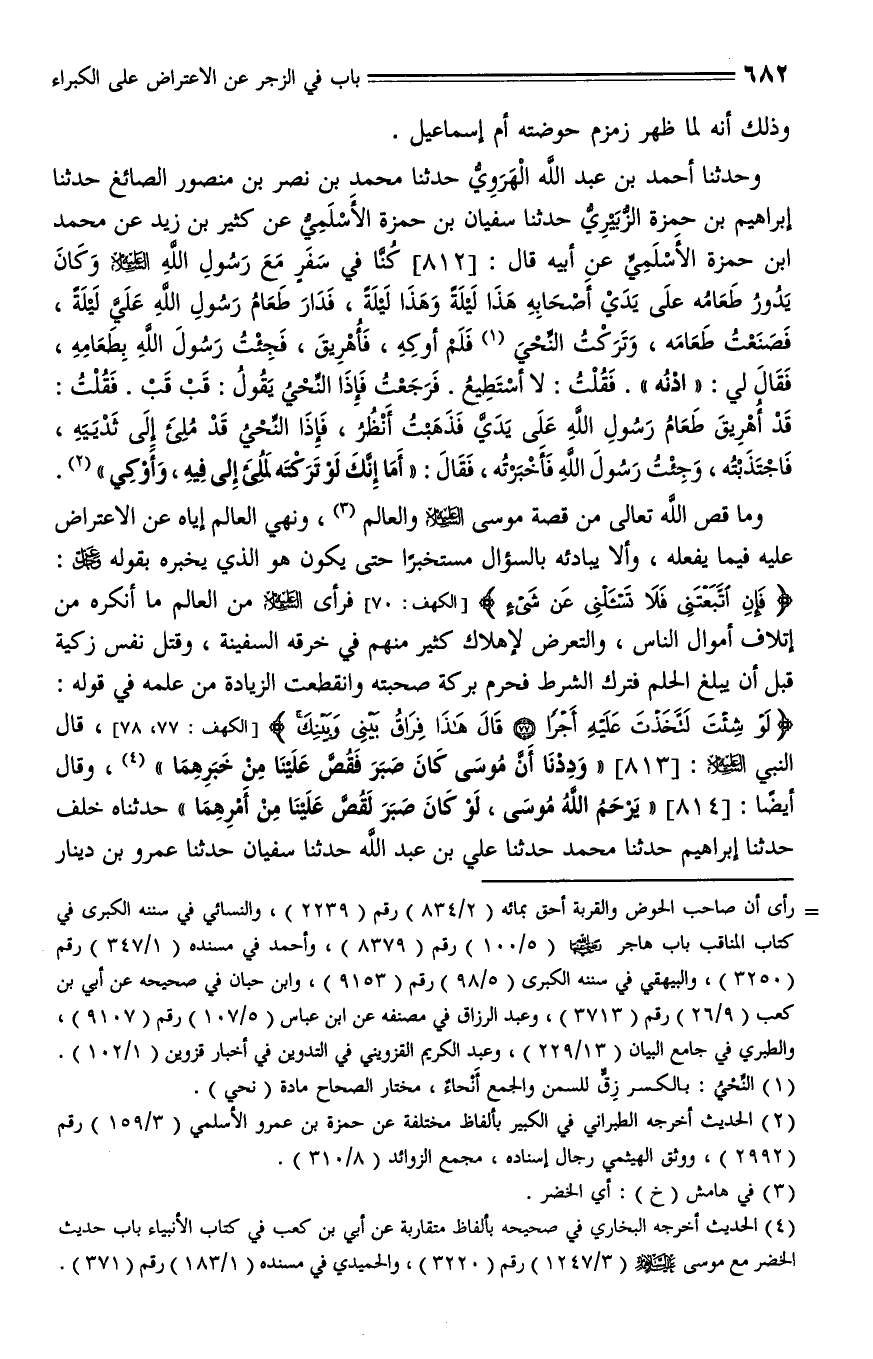 812 - وحدثنا أحمد بن عبد الله الهروي، حدثنا محمد بن نصر بن منصور الصائغ، حدثنا إبراهيم بن حمزة الزبيري، حدثنا سفيان بن حمزة الأسلمي، عن كثير بن زيد، عن محمد بن حمزة الأسلمي، عن أبيه (ق253ب)، قال: كنا في سفر مع رسول الله عليه السلام، وكان يدور طعامه على يدي أصحابه هذا ليلة وهذا ليلة، فدار طعام رسول الله عليَّ ليلة، فصنعت طعامه وتركت النحى فلم أوكه فأهريق، فجئت رسول الله بطعامه، فقال لي: " ادنه " فقلت: لا أستطيع. فرجعت، فإذا النحي يقول: قَبْ قَبْ. فقلت: قد أهريق طعام رسول الله على يدي، فذهبت أنظر فإذا النحى قد مُلئ إلى ثدييه فاجتذبته، وجئت رسول الله فأخبرته، فقال: " أما إنك لو تركته لمُلئ إلى فيه وأوكي ".