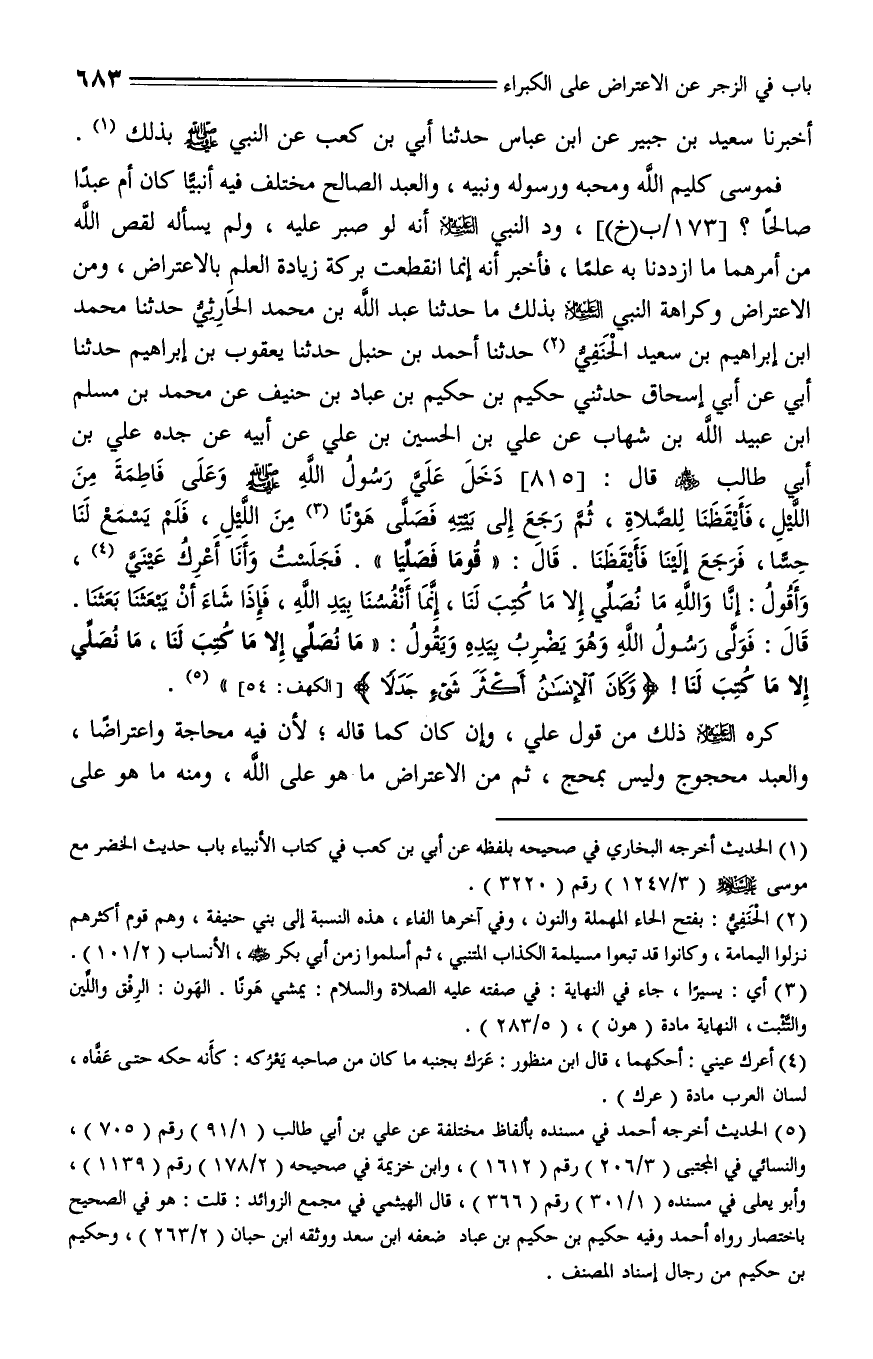 815 - حدثنا عبد الله بن محمد الحارثي، حدثنا محمد بن إبراهيم بن سعيد الحنفي، حدثنا أحمد بن حنبل، حدثنا يعقوب بن إبراهيم، حدثنا أبي، عن أبي إسحاق، حدثني حكيم بن حكيم بن عباد بن حنيف، عن محمد بن مسلم بن عبيد الله بن شهاب، عن علي بن الحسين بن علي، عن أبيه، عن جده علي بن أبي طالب - رضي الله عنه - قال: " دخل عليَّ رسول الله - صلى الله عليه وسلم - وعلى فاطمة من الليل، فأيقظنا للصلاة ثم رجع إلى بيته فصلى هونا من الليل فلم يسمع لنا حساً فرجع إلينا فأيقظنا، قال: قوما فصليا، فجلست وأنا أَعْرِكُ عيني وأقول: إنا والله ما نصلي إلى ما كتب الله لنا، إنما أنفسنا بيد الله، فإذا شاء أن يبعثنا بعثنا، قال: فولى رسول الله، وهو يضرب بيده ويقول: ما نصلي إلى ما كتب الله لنا، ما نصلي إلا ما كتب الله لنا، {وَكَانَ الْإِنْسَانُ أَكْثَرَ شَيْءٍ جَدَلًا} ".