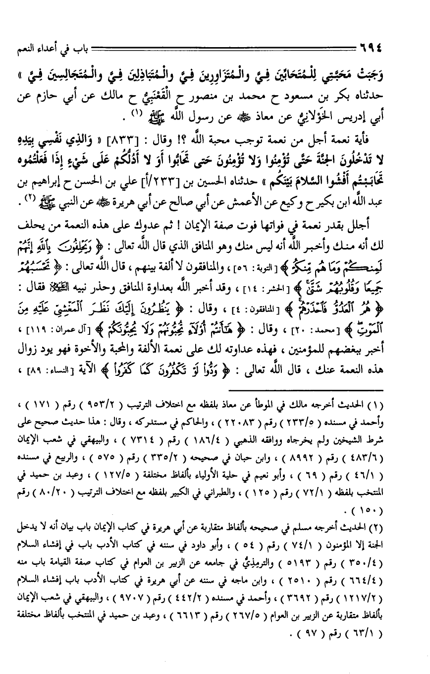 833 - وقال: " والذي نفسي بيده لا تدخلون الجنة حتى تؤمنوا، ولا تؤمنون حتى تحابوا، أوَ لا أدلكم على شيء إذا فعلتموه تحاببتم، أفشوا السلام بينكم ".