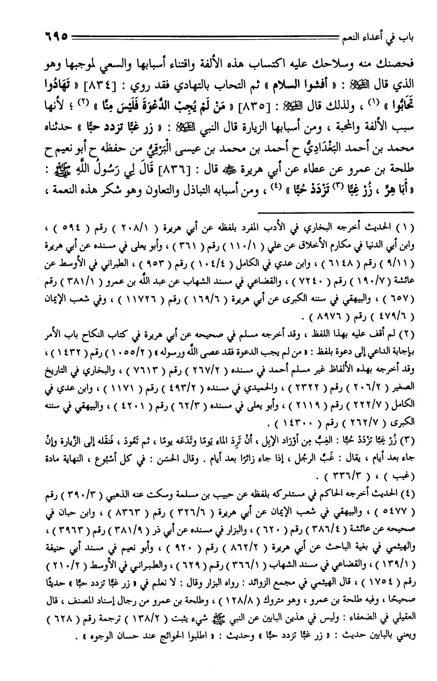 836 - حدثنا محمد بن أحمد البغدادي، حدثنا أحمد بن محمد بن عيسى البرقي من حفظه، حدثنا أبو نعيم، حدثنا طلحة بن عمرو، عن عطاء، عن أبي هريرة - رضي الله عنه - قال: قال لي رسول الله - صلى الله عليه وسلم -: " أبا هر زُرْ غِبّاً تزدد حُبّاً ".