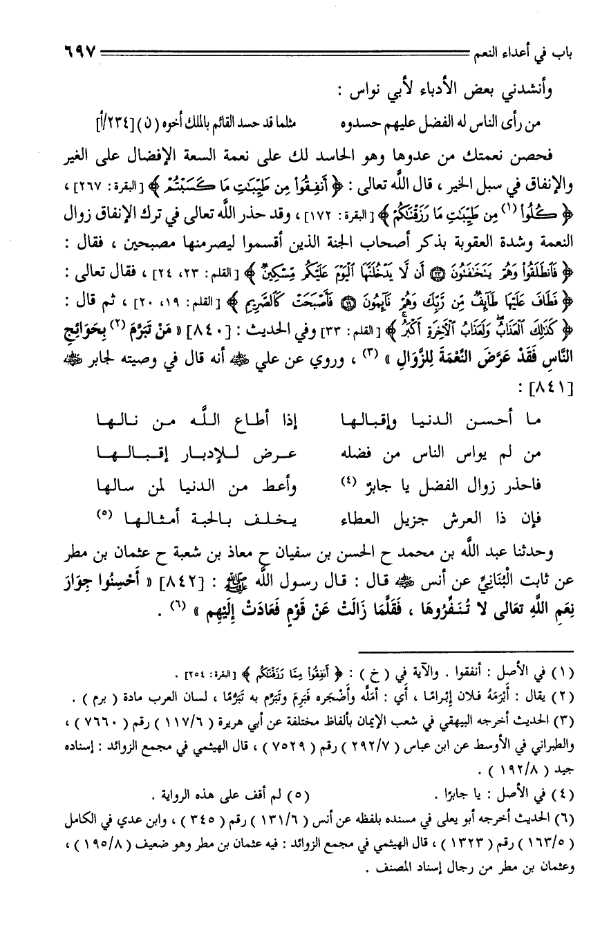 842 - حدثنا عبد الله بن محمد، حدثنا الحسن بن سفيان، حدثنا معاذ بن شعبة، حدثنا عثمان بن مطر، عن ثابت البناني، عن أنس - رضي الله عنه - قال: قال رسول الله - صلى الله عليه وسلم -: " أحسنوا جوار نعم الله تعالى لا تُنَفِّروها، فقَلَّما زالت عن قوم فعادت إليهم ".