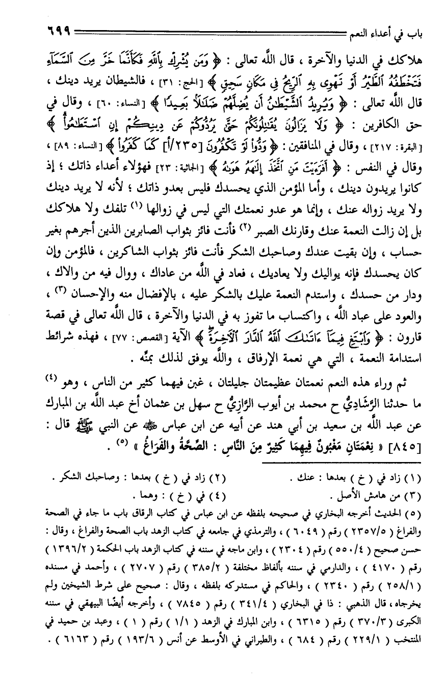 845 - حدثنا الرشادي، حدثنا محمد بن أيوب الرازي، حدثنا سهل بن عثمان، أخبرنا عبد الله بن المبارك، عن عبد الله بن سعيد بن أبي هند، عن أبيه، عن ابن عباس - رضي الله عنه - عن (ق262ب) النبي - صلى الله عليه وسلم - قال: " نعمتان مغبون فيهما كثير من الناس: الصحة والفراغ ".