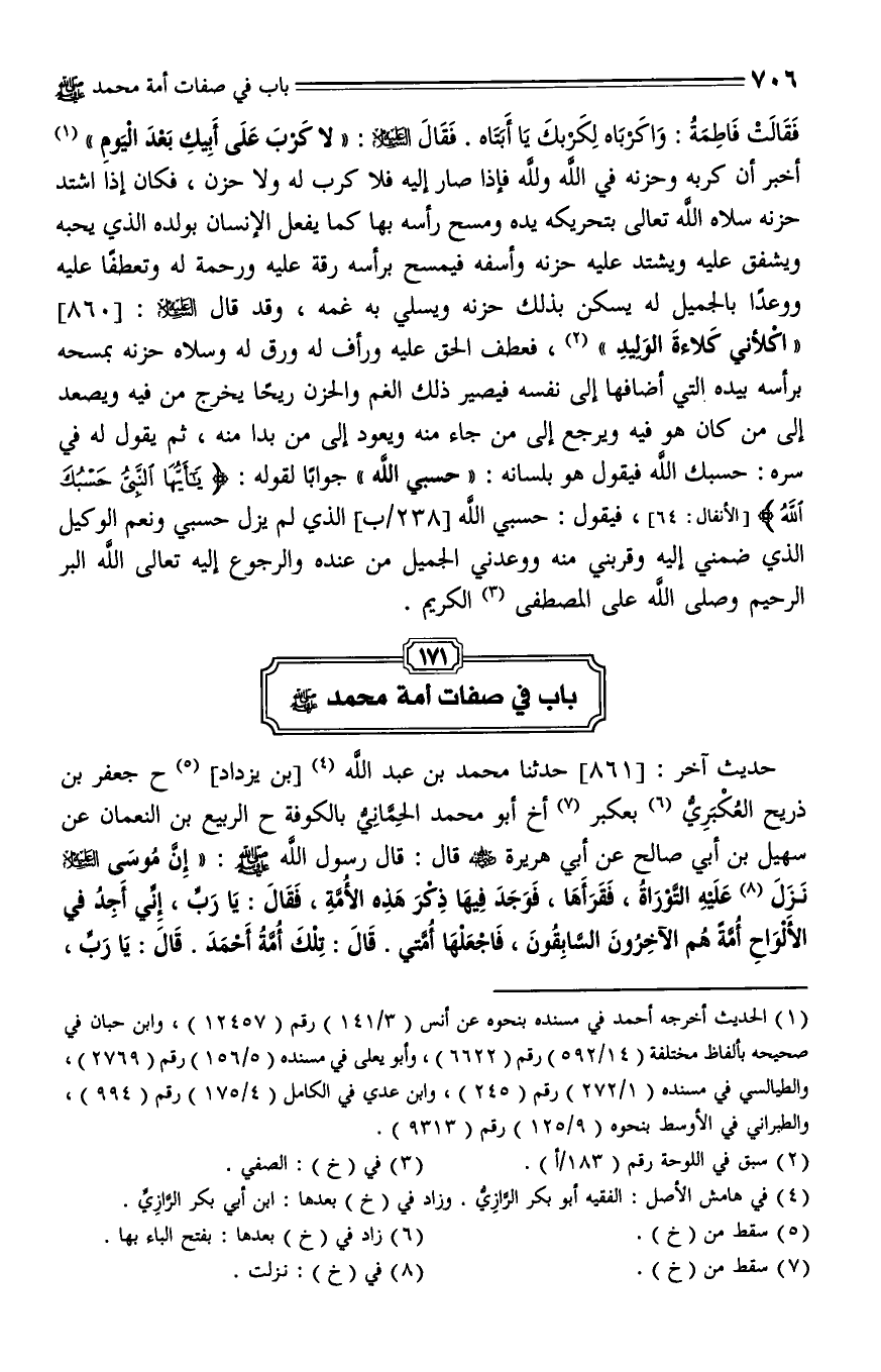861 - حدثنا محمد بن عبد الله (1) بن يزداد، حدثنا جعفر بن دُريج العُكْبَريُّ بعكبر، أخبرني أبو محمد الحماني بالكوفة، حدثنا الربيع بن النعمان، عن سهيل بن أبي صالح، [عن أبيه] (2) عن أبي هريرة - رضي الله عنه - قال: قال رسول الله - صلى الله عليه وسلم -: " أن موسى - عليه السلام - نزلت (3) عليه التوراة فقرأها فوجد فيها ذكر هذا الأمة فقال: يا رب إني أجد في الألواح أمة هم الآخرون السابقون فاجعلها أمتي، قال: تلك أمة أحمد، قال: يا رب إني أجد في الألواح أمة هم الشافعون المشفوع لهم فاجعلها أمتي، قال: تلك أمة أحمد، قال: يا رب إني أجد في الألواح أمة أناجيلهم في صدورهم يقرؤونه ظاهراً فاجعلها أمتي، قال: تلك أمة أحمد، قال: يا رب إني أجد في الألواح أمة [يأكلون الفيء فاجعلها أمتي، قال تلك أمة محمد، قال: يا رب إني أجد في الألواح أمة] (4) يجعلون الصدقة في بطونهم ويؤجرون عليها فاجعلها أمتي، قال: تلك أمة أحمد، قال: يا رب إني أجد في الألواح أمة إذا هم أحدهم بحسنة فلم يعملها كتبت له حسنة واحدة، وإن عملها كتبت له عشر حسنات (ق266أ) فاجعلها أمتي، قال: تلك أمة أحمد، قال: يا رب إني أجد في الألواح أمة إذا هم أحدهم بسيئة ثم لم يعملها لم تكتب عليه وإن عملها كتبت له سيئة واحدة فاجعلها أمتي، قال: تلك أمة أحمد، قال: يا رب إني أجد في الألواح أمة يرثون علم الأولين والآخرين (5)، فيقتلون قرون الضلالة المسيح الدجال، فاجعلها أمتي، قال تلك أمة أحمد، قال: يا رب فاجعلني من أمة أحمد، فأعطي عند ذلك خصلتين، فقال الله تعالى: {يَا مُوسَى إِنِّي اصْطَفَيْتُكَ عَلَى النَّاسِ بِرِسَالَاتِي وَبِكَلَامِي فَخُذْ مَا آتَيْتُكَ وَكُنْ مِنَ الشَّاكِرِينَ} فقال: قد رضيت ربي ".