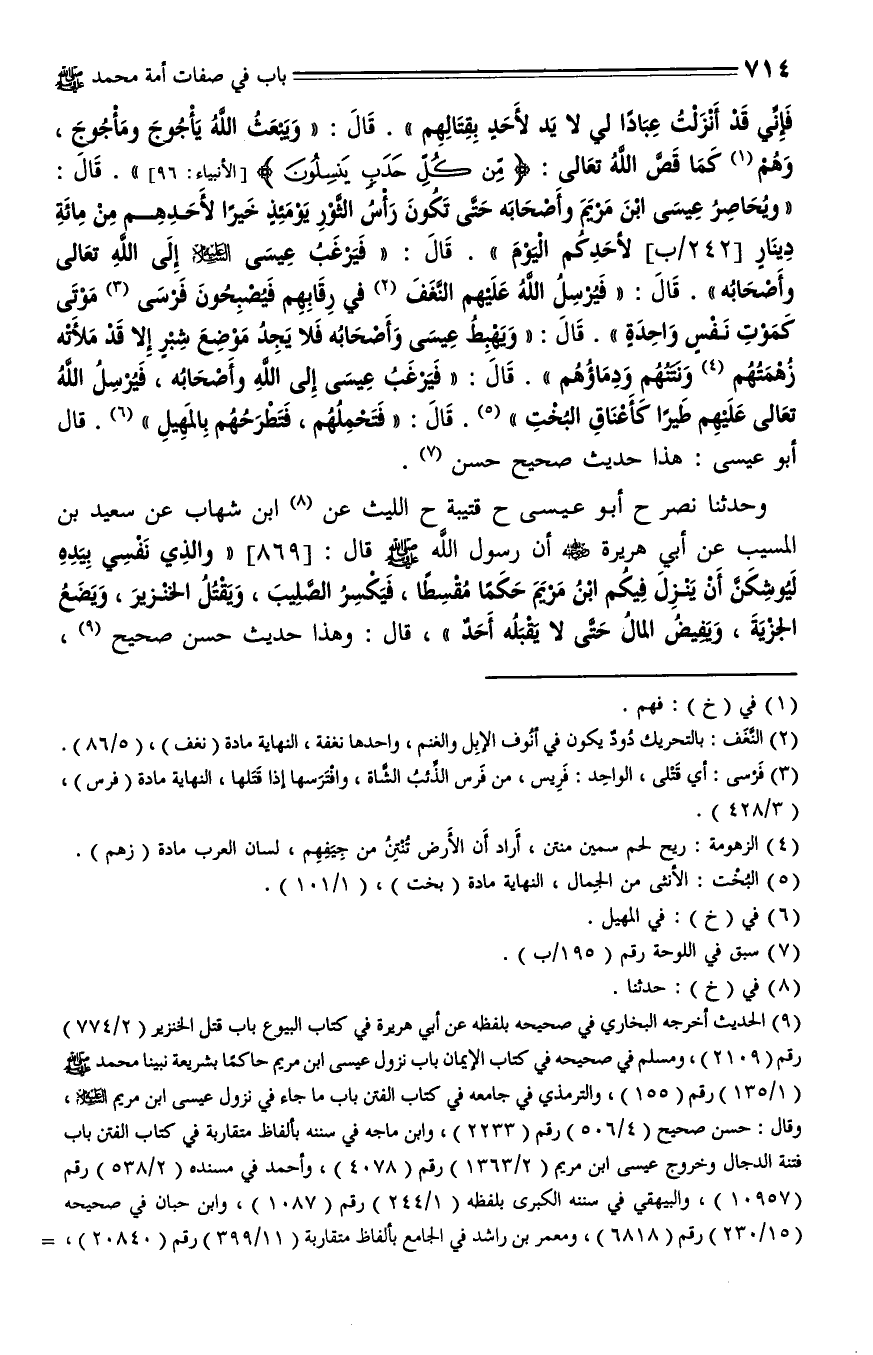 869 - وحدثنا نصر، حدثنا أبو عيسى، حدثنا قتيبة، حدثنا الليث، عن ابن شهاب، عن سعيد بن المسيب، عن أبي هريرة - رضي الله عنه - أن رسول الله - صلى الله عليه وسلم - قال: " والذي نفسي بيده ليوشكن أن ينزل فيكم ابن مريم حكما مقسطاً، فيكسر الصليب ويقتل الخنزير ويضع الجزية، ويفيض المال حتى لا يقبله أحدٌ ". قال: وهذا حديث حسن صحيح.
