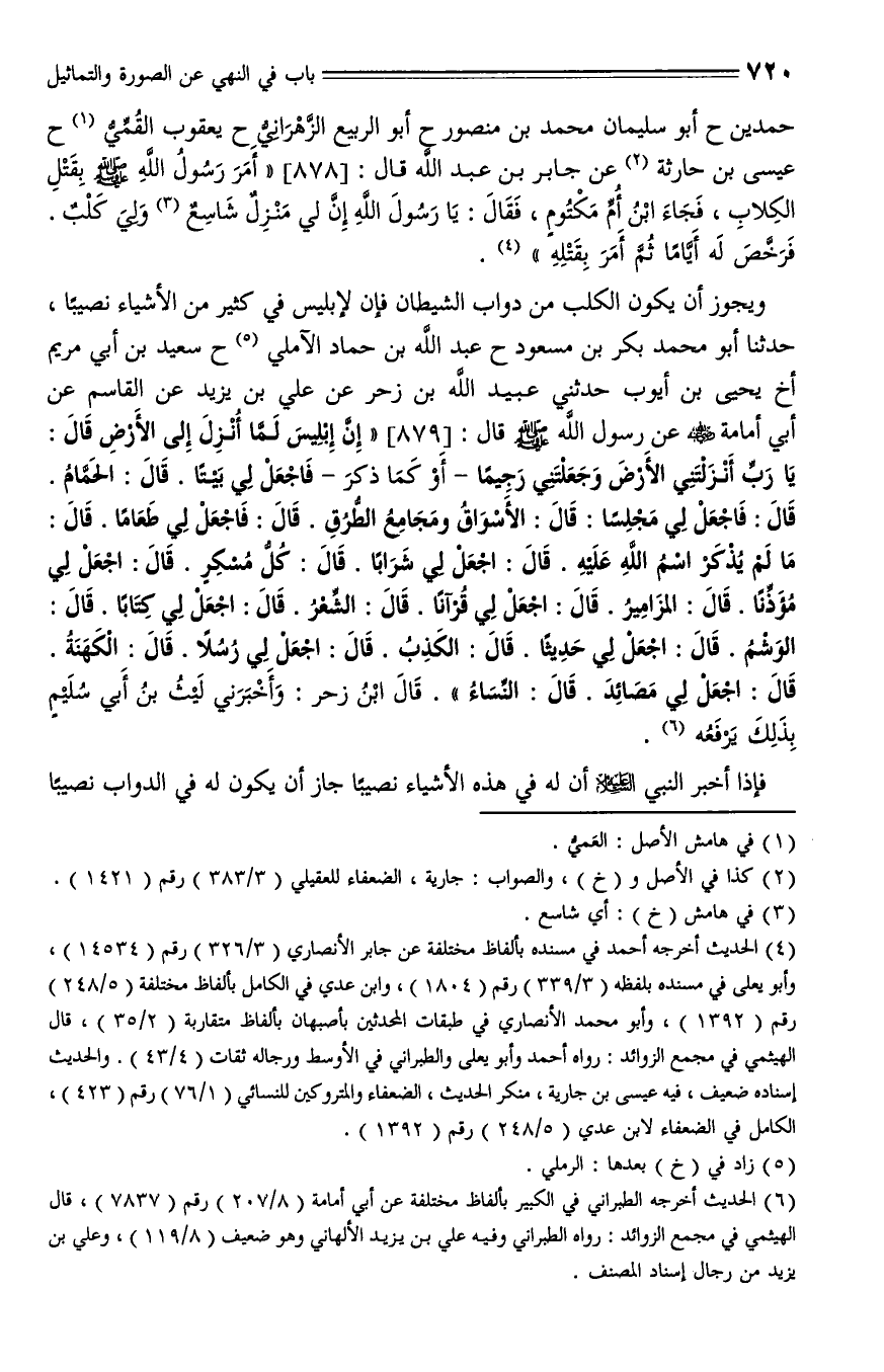 879 - حدثنا أبو محمد بكر بن مسعود، حدثنا عبد الله بن حماد الآملي، حدثنا سعيد بن أبي مريم، أخبرنا يحيى بن أيوب، حدثني عبيد الله بن زحر، عن علي بن يزيد، عن القاسم، عن أبي أمامة - رضي الله عنه - عن رسول الله - صلى الله عليه وسلم - قال: " إن إبليس لما أنزل إلى الأرض، قال: يا رب أنزلتني على الأرض وجعلتني رجيما - أو كما ذكر - فاجعل لي بيتاً، قال: الحمام، قال: فاجعل لي مجلساً، قال: الأسواق ومجامع الطرق، قال: فاجعل لي طعاماً، قال: ما لم يذكر اسم الله عليه، قال: اجعل لي شرابا، قال: كل مسكر، قال: اجعل لي مؤذنا، قال: المزامير، قال: اجعل لي قرآنا، قال: الشعر، قال: اجعل لي كتابا، قال: الوشم، قال: اجعل لي حديثاً، قال: الكذب، قال: اجعل لي رسلا، قال: الكهنة، قال: اجعل لي مصائد، قال النساء ". قال ابن زحر: وأخبرني ليث بن أبي سليم بذلك يرفعه.