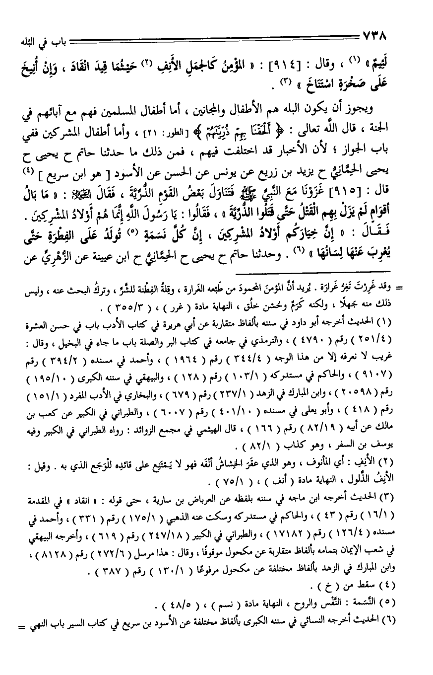 915 - حدثنا حاتم، حدثنا يحيى، حدثنا يحيى الحماني، حدثنا يزيد بن زريع، عن يونس، عن الحسن، عن الأسود - هو ابن سريع - قال: " غزونا مع النبي - صلى الله عليه وسلم - فتناول بعض القوم الذرية، فقال - عليه السلام -: ما بال أقوام لم يزل بهم القتل حتى قتلوا الذرية، فقالوا: يا رسول الله، إنما هم أولاد المشركين، فقال: إن خياركم أولاد المشركين، إن كل نسمة تولد على الفطرة حتى يُعْرِبَ عَنْها لسانها ".