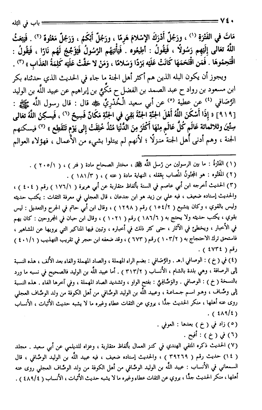 919 - حدثنا بكر بن مسعود بن رواد، حدثنا عبد الصمد بن الفضل، حدثنا مكي بن إبراهيم، عن عبيد الله بن الوليد الرُّصافي، عن عطية [العوفي] (1)، عن أبي سعيد الخدري - رضي الله عنه - قال: قال رسول الله - صلى الله عليه وسلم -: " إذا أسكن الله أهل الجنة الجنة، بقى في الجنة مكان فسيح فيُسكن الله تعالى ستين وثلاثمائة عالمٍ كل عالم منها أكبر من الدنيا منذ خلقت إلى يوم ينقطع فيسكنهم الجنة، وهم أدنى أهل الجنة منزلا، لأنهم لم يُبتلوا بشيء من الأعمال ".