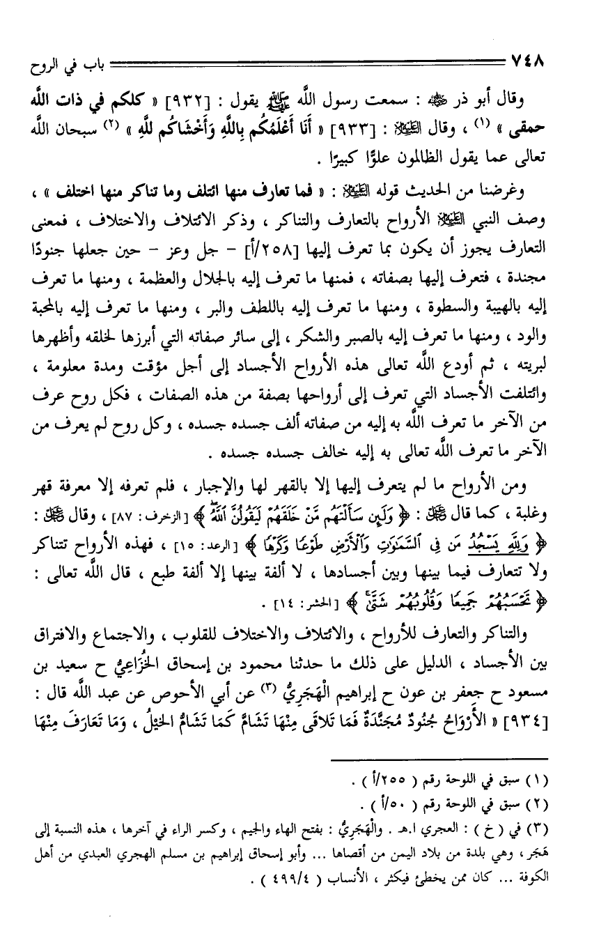 934 - حدثنا محمود بن إسحاق الخزاعي، حدثنا سعيد بن مسعود، حدثنا جعفر بن عون، حدثنا إبراهيم الهجري، عن أبي الأحوص، عن عبد الله، قال: " الأرواح جنود مجندة، فما تلاقي منها تشامَّ، كما تشامُّ الخيل، وما تعارف منها ائتلف، وما تناكر منها اختلف ".