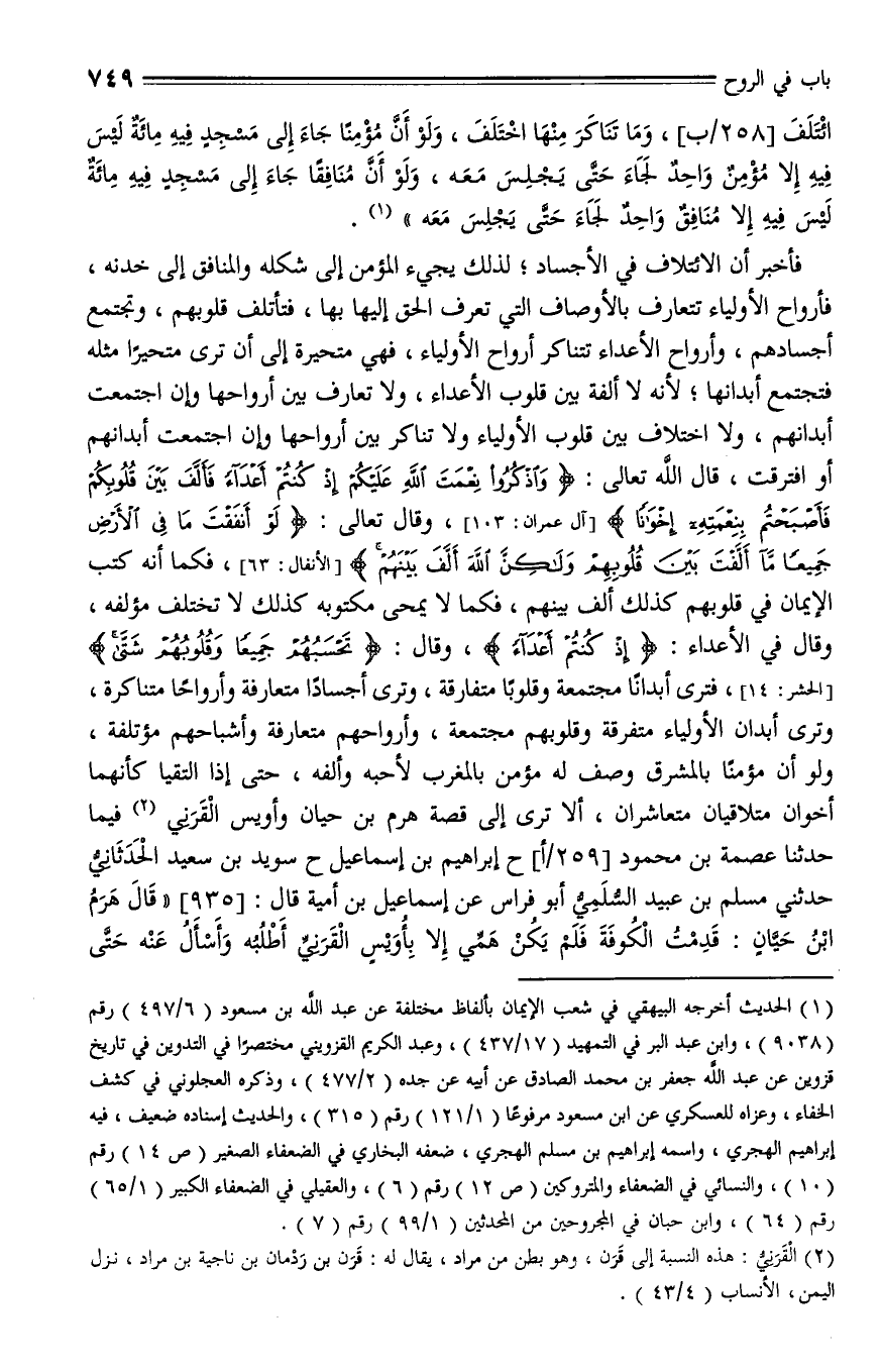 935 - حدثنا عصمة بن محمود، حدثنا إبراهيم بن إسماعيل، ح سويد بن سعيد الحدثاني، حدثني مسلم بن عبيد السُّلمي أبو فراس، عن إسماعيل بن أمية، قال: " قال هَرَمُ بن حيان: قدمت الكوفة فلم يكن همي إلا بأويس القرني أطلبه وأسأل عنه حتى سقطت عليه فسلمت عليه فرد علي ونظر إليّ، قلتُ: رحمك الله يا أويس ويغفر لك، كيف أنت يرحمُك الله؟ ثم خنَقَتْنِي العَبرَةُ من حُبِّي إياه ورقتي له حتى بكيت وبكى، ثم قال: وأنت فحياك الله يا هرم بن حيان، كيف أنت يا أخي؟ من دلَّك عليَّ؟ قال: قلت: الله. قال: لا إله إلا الله سبحان ربنا إن كان وعد ربنا لمفعولا. قال: فعجبت حين عرفني وسمَّاني، والله ما رأيته قبل ذلك ولا رآني. قال: قلتُ: من أين عرفت اسمي واسم أبي وما رأيتك قبل اليوم ولا رأيتني؟! قال: نبأني العليم الخبير، عرفت روحي روحك حين كلمت نفسي نفسك ".