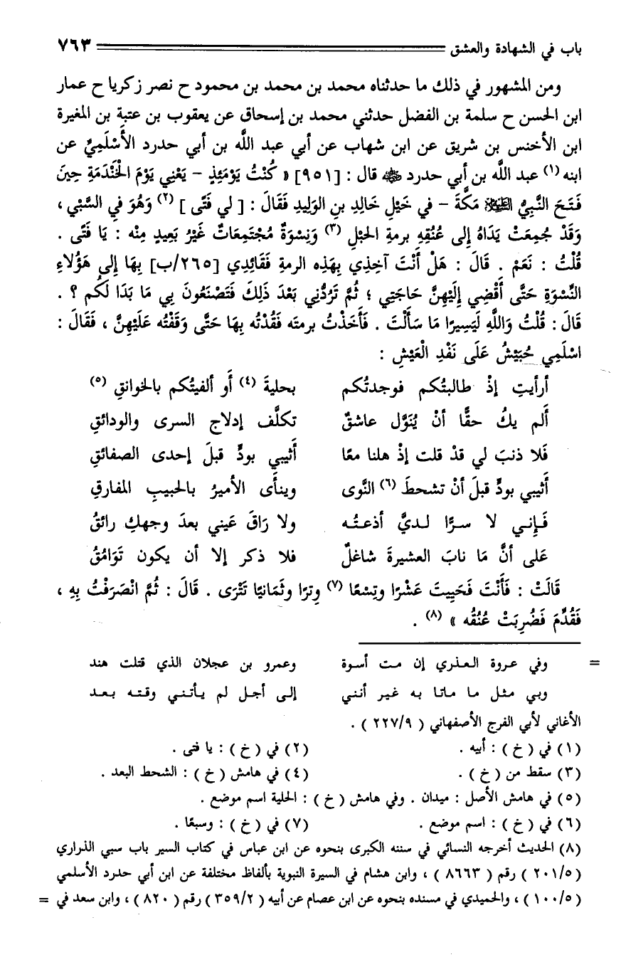 951 - حدثنا محمد بن محمد بن محمود، حدثنا نصر بن زكريا، حدثا عمار بن الحسن، حدثنا سلمة بن الفضل، حدثني محمد بن إسحاق، عن يعقوب بن عتبة بن المغيرة بن الأخنس بن شريق، عن ابن شهاب، عن أبي عبد الله بن أبي حدرد الأسلمي، عن أبيه عبد الله بن أبي حدرد - رضي الله عنه - قال: " كنت يومئذ يعني يوم الخندمة حين فتح النبي عليه السلام مكة في خيل خالد بن الوليد، فقال لي فتى وهو في السبي وقد جمعت يداه إلى عنقه برمة الحبل، ونسوة مجتمعات غير بعيد منه: يا فتى، قلت: نعم، هل أنت آخذي بهذه البرمة فقائدي بها إلى هؤلاء النسوة حتى أقضي إليهن حاجتي، ثم تردني بعد ذلك فتصنعون ما بدا لكم؟ قال: قلت: والله ليسيراً ما سألت، فأخذت برمته فقدته بها حتى وقفته عليهن، فقال: أسلمي حُبيش على نفد العيش (ق295ب)