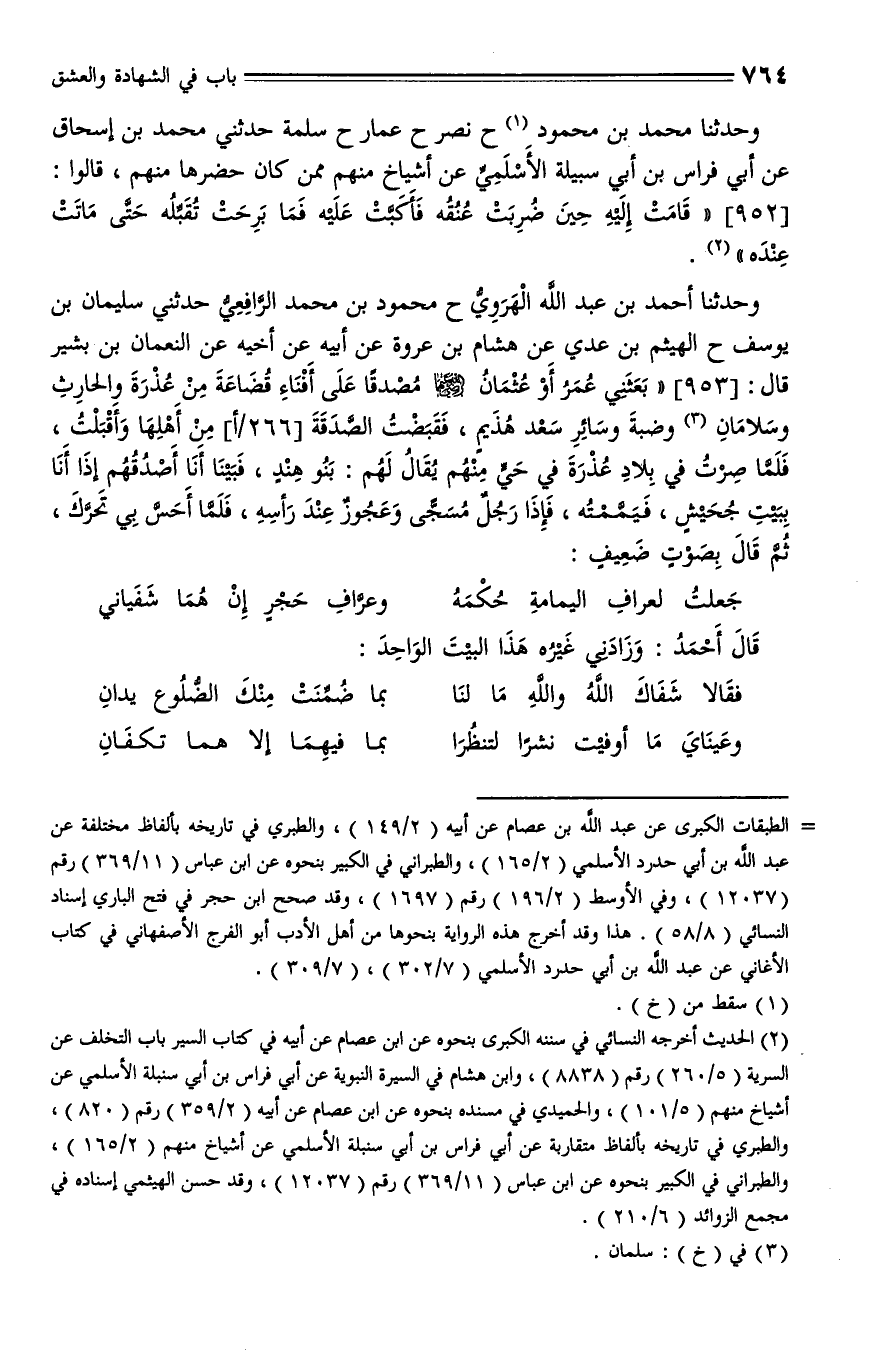 953 - وحدثنا أحمد بن عبد الله الهروي، حدثنا محمود بن محمد الرافعي، حدثني سليمان بن يوسف بن عدي، عن هشام بن عروة، عن أبيه، عن أخيه، عن النعمان بن بشير، قال: "بعثني عمر أو عثمان - رضي الله عنهما - مصدقاً على أفناء قُضاعة من عُذْرَةَ والحارث وسلمان (1) وضبة وسائر سعد هُذيم، فقبضت الصدقة من أهلها وأقبَلْتُ، فلما صرتُ في بلاد عُذرَةَ في حي منهم يقال لهم: بنو هند، فينا أنا أصدقهم إذا أنا ببيت جُحَيْشٍ، فيَمّمتُه، فإذا رجل مُسَجّى وعجوز عند رأسه، فلما أحس بي تحرك، ثم قال: بصوت ضعيف: