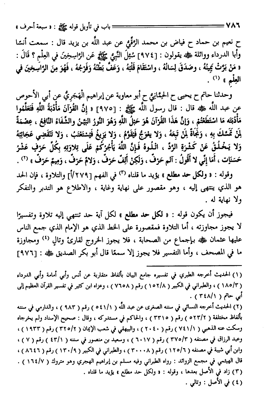975 - وحدثنا حاتم، حدثنا يحيى، حدثنا الحماني، حدثنا أبو معاوية، عن إبراهيم الهجري، عن أبي الأحوص، عن عبد الله - رضي الله عنه - قال: قال رسول الله صلى الله عليه وسلم: " إن هذا القرآن مأدبة الله فتعلموا مأدبته ما استطعتم، وإن هذا القرآن هو حبل الله، وهو النور البين، والشفاء النافع، عصمة لمن تمسك به، ونجاة لمن تبعه، لا يعوج فيقوَّم، ولا يزيغ فيُستعتبُ، ولا تنقضي عجائبه، ولا يخلق عن كثرة الرد، اتلوه فإن الله يأجركم على تلاوته بكل حرف عشر حسنات، أما إني لا أقول آلم حرف، ولكن ألف حرف، ولام حرف، ميم حرف ".