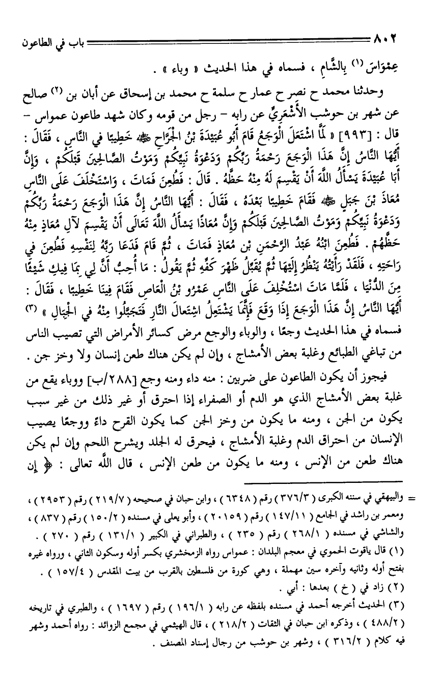 993 - وحدثنا محمد، حدثنا نصر، حدثنا عمار، حدثنا سلمة، حدثنا محمد بن إسحاق، عن أبان بن صالح، عن شهر بن حوشب الأشعري، عن رابه - رجل من قومه، وكان شهد طاعون عمواس - قال: " لما اشتعل الوجع قام أبو عبيدة بن الجراح - رضي الله عنه - خطيباً في الناس، فقال: أيها الناس إن هذا الوجع رحمة ربكم، ودعوة نبيكم، وموت الصالحين قبلكم، وإن أبا عبيدة يسأل الله أن يقسم له منه حظه، قال: فطُعن فمات واستخلف على الناس معاذ بن جبل - رضي الله عنه - فقام خطيباً بعده، فقال: أيها الناس، إن هذا الوجع رحمة ربكم، ودعوة نبيكم، وموت الصالحين قبلكم، وإن معاذاً يسأل الله تعالى أن يقسِّم لآل معاذ منه حظهم، فطُعن ابنه عبد الرحمن بن معاذ فمات، ثم قام فدعا ربه لنفسه فطُعن في راحته، فلقد رأيته ينظر إليها ثم يقبل ظهر كفه ثم يقول: ما أحب أن لي فما فيك شيئاً من الدنيا، فلما مات استخلف على (ق318ب) الناس عمرو بن العاص، فقام فينا خطيباً، فقال: أيها الناس إن هذا الوجع إذا وقع فإنما يشتعل اشتعال النار، فتجبلوا منه في الجبال ".
