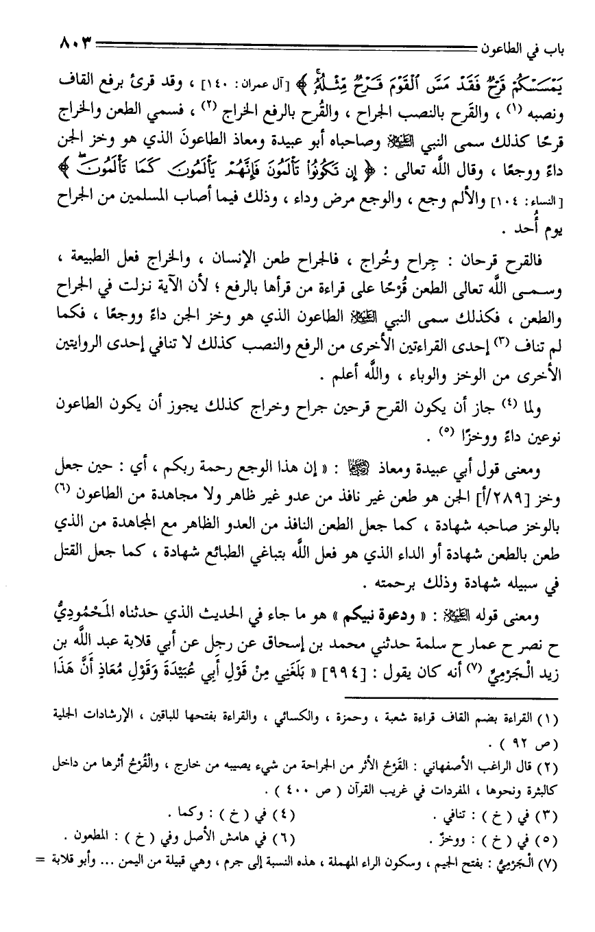 994 - حدثنا المحمودي، حدثنا نصر، حدثنا عمار، حدثنا سلمة، حدثني محمد بن إسحاق، عن رجل، عن أبي قلابة عبد الله بن زيد الجرمي، أنه كان يقول: بلغني من قول أبي عبيدة، وقول معاذ " أن هذا الوجع رحمة ربكم، ودعوة نبيكم، وموت الصالحين قبلكم، أقول: كيف دعا به رسول الله - عليه السلام - لأمته حتى حدثني بعض من لا أتهم عن رسول الله - عليه السلام - أنه سمعه منه، وجاءه جبريل - عليه السلام - فقال: " إن فناء أمتك يكون بطعن أو طاعون "، قال: فجعلَ رسول الله - عليه السلام - يقول: " اللهم فبالطاعون " مرتين. قال: فعرفتُ أنها التي قال أبو عبيدة ومعاذ.