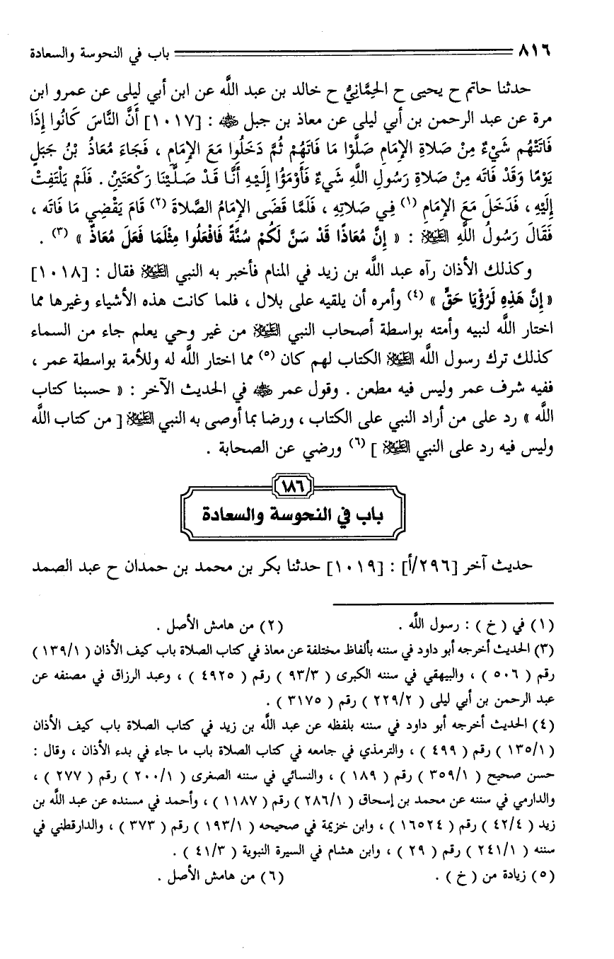 1017 - حدثنا حاتم، حدثنا يحيى، حدثنا الحماني، حدثنا خالد بن عبد الله، عن ابن أبي ليلى، عن عمرو بن مرة، عن عبد الرحمن بن أبي ليلى، عن معاذ بن جبل - رضي الله عنه - أن الناس كانوا إذا فاتتهم شيء من صلاة الإمام (ق325ب)، صلوا ما فاتهم ثم دخلوا مع الإمام، فجاء معاذ يوما وقد فاته من صلاة الإمام شيء فأومئوا إليه أنا قد صلينا ركعتين، فلم يلتفت إليهم فدخل مع الإمام في صلاته، فلما قضى الإمام الصلاة، قام يقضي، فقال رسول الله عليه السلام: " إن معاذً قد سن لكم سنةً فافعلوا مثل ما فعل معاذ ".