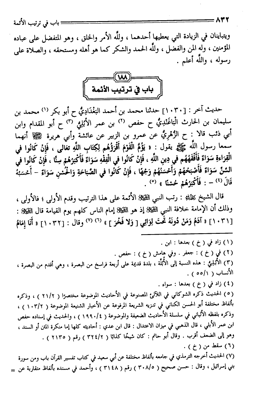 1030 - حدثنا محمد بن أحمد البغدادي، حدثنا أبو بكر محمد بن سليمان بن الحارث الباغندي، حدثنا حفص بن عمر الأبلي، حدثنا أبو المقدام، وابن أبي ذئب، قالا: حدثنا الزهري، عن عروة بن الزبير، عن عائشة، وأبي هريرة - رضي الله عنهما - أنهما سمعا رسول الله - صلى الله عليه وسلم - يقول: " يؤم القوم أقرأهم لكتاب الله تعالى، فإن كانوا في القراءة سواء، فأفقههم في دين الله، فإن كانوا في الفقه سواء، فأكبرهم سناً، فإن كانوا في السن سواء (ق334ب) فأصبحهم وأحسنهم وجهاً، فإنا كانوا في الصباحة والحسن - أحسبه قال: - سواء، فأكبرهم حُسناً ".
