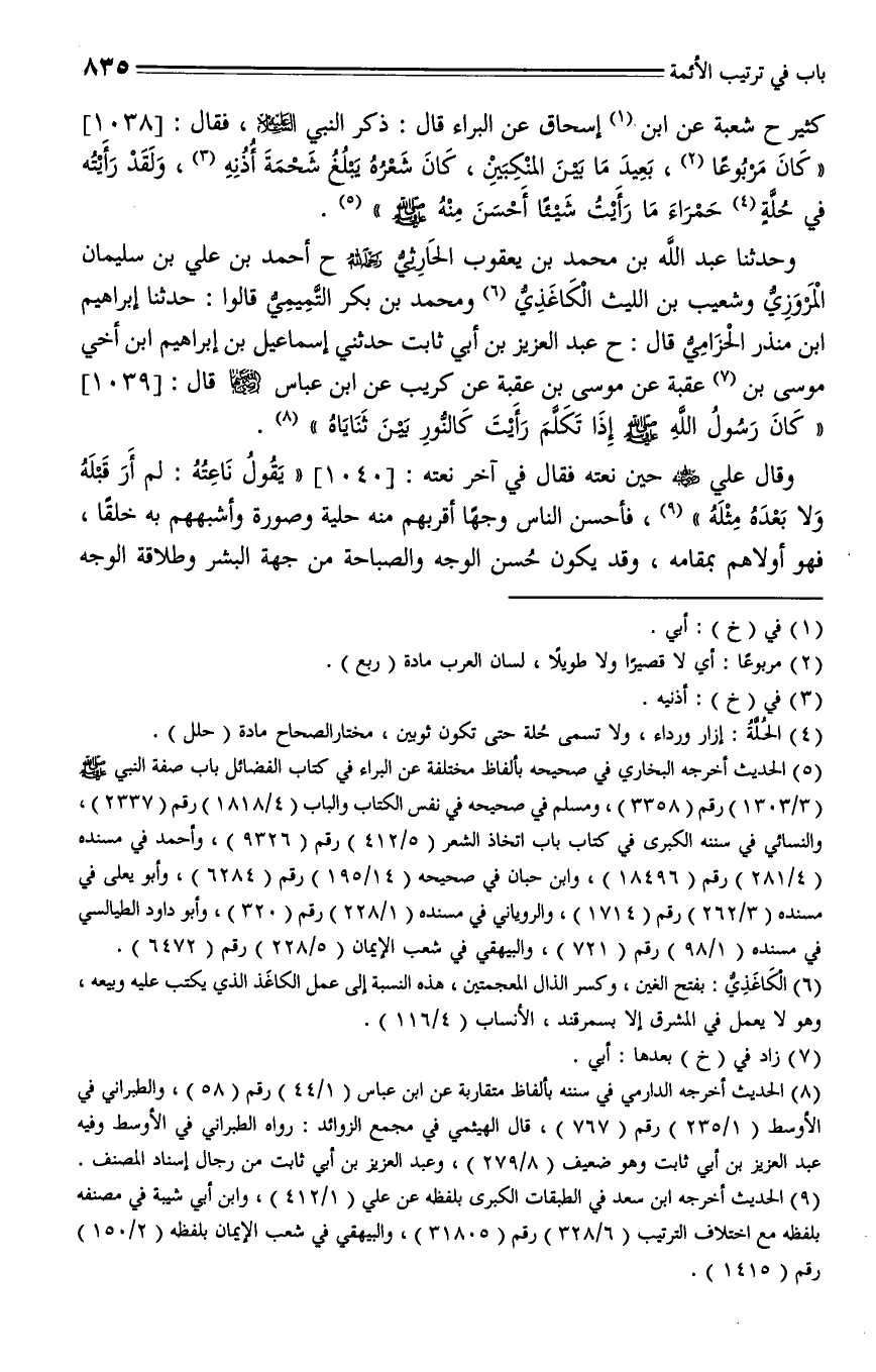 1039 - حدثنا عبد الله بن محمد بن يعقوب الحارثي - رحمه الله - حدثنا أحمد بن علي بن سليمان المروزي، وشعيب بن الليث الكاغذي، ومحمد بن بكر التميمي، قالوا: ثنا إبراهيم بن المنذر الحزامي، قال: حدثنا عبد العزيز بن أبي ثابت، حدثني إسماعيل بن إبراهيم ابن أخي موسى بن عقبة، عن موسى بن عقبة، عن كريب، عن ابن عباس - رضي الله عنه - قال: " كان رسول الله - صلى الله عليه وسلم - إذا تكلم رأيت النور بين ثناياه ".