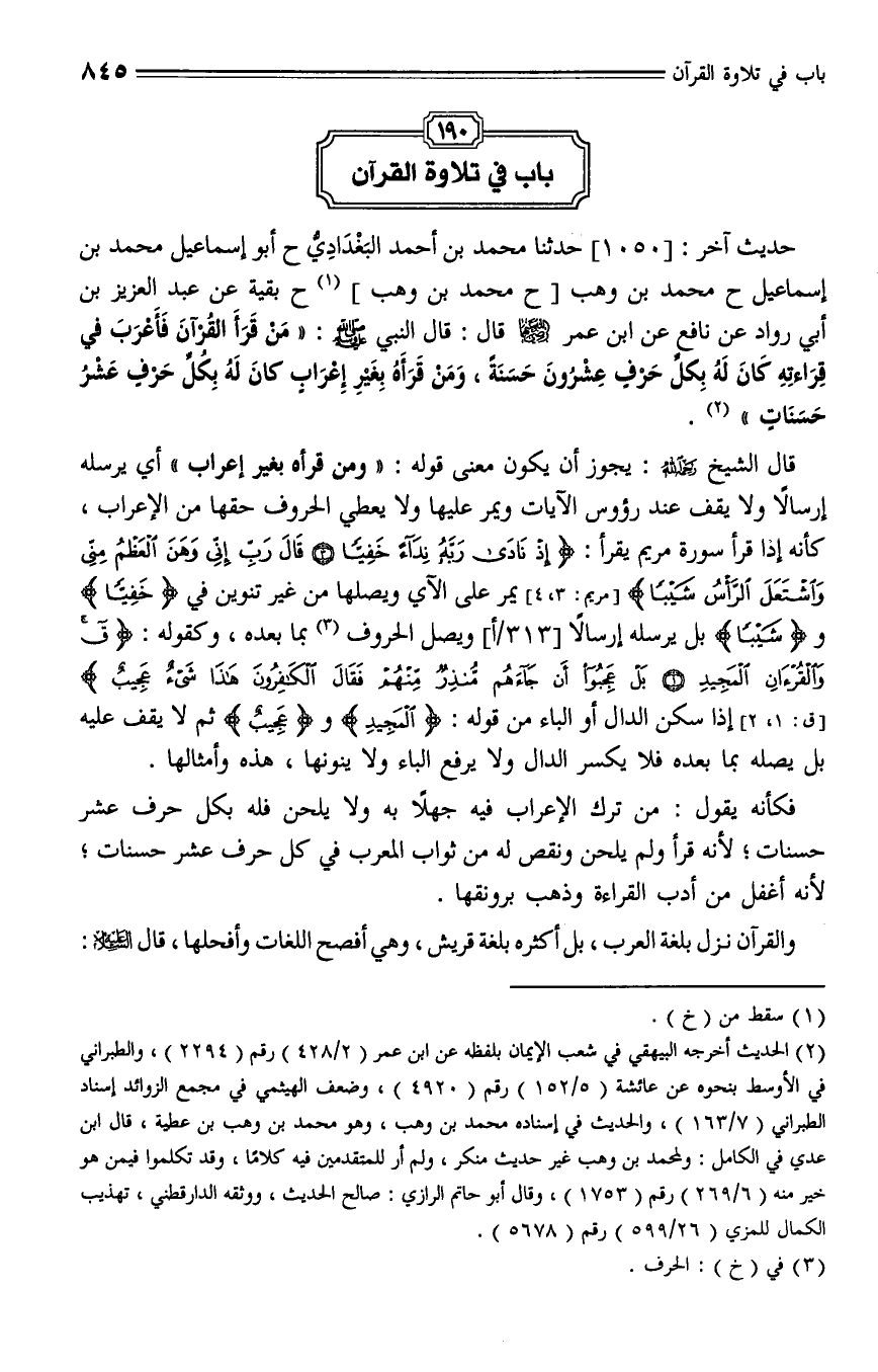 1050 - حدثنا محمد بن أحمد البغدادي، حدثنا أبو إسماعيل محمد بن إسماعيل، حدثنا محمد بن وهب، حدثنا بقية، عن عبد العزيز بن أبي رواد، عن نافع، عن ابن عمر، رضي الله عنهما، قال: قال النبي - صلى الله عليه وسلم -: " من قرأ القرآن فأعرب في قراءته كان له لكل حرف عشرون حسنة، ومن قرأه بغير إعراب كان له بكل حرف عشر حسنات ".