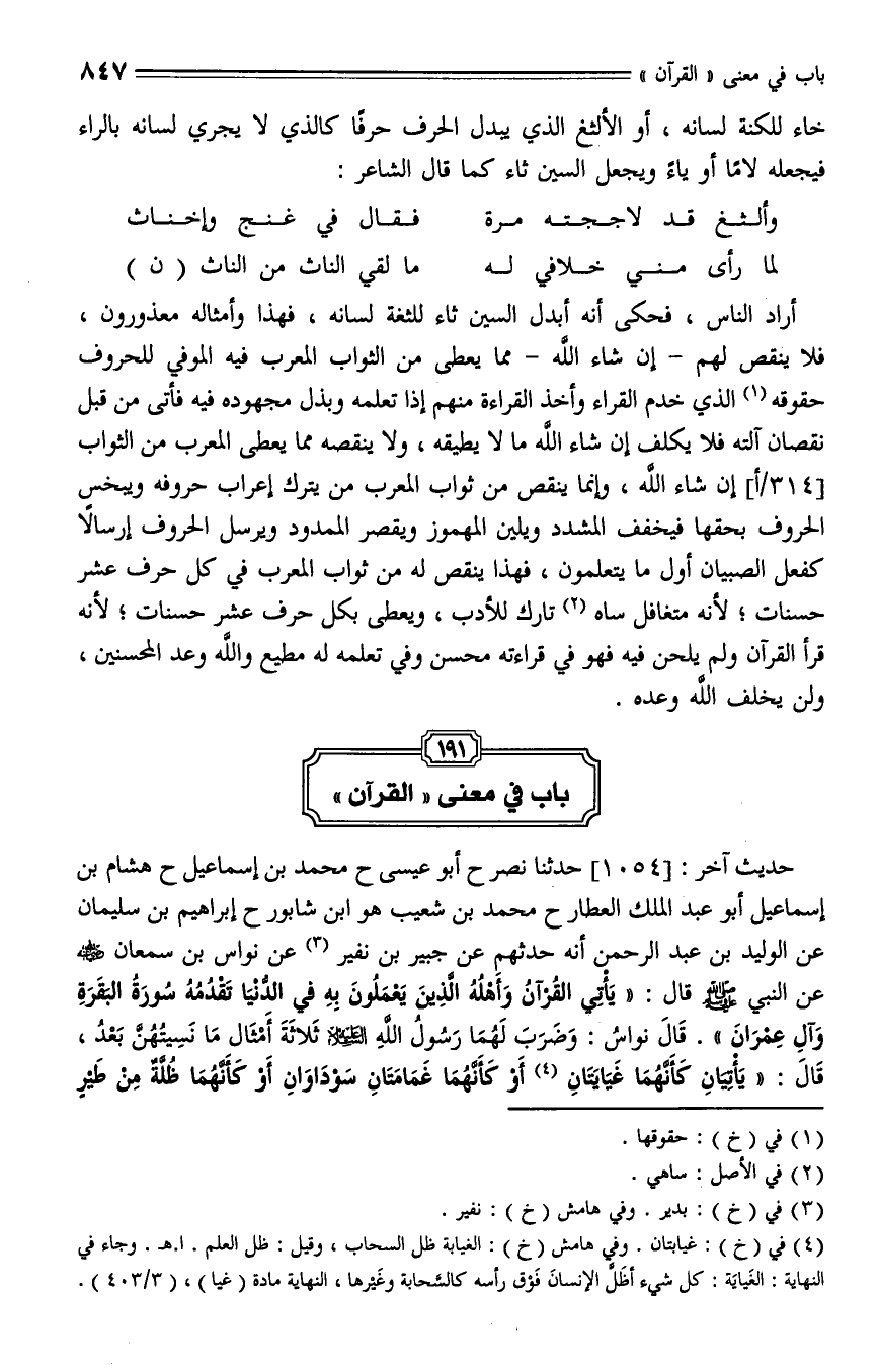1054 - حدثنا نصر، حدثنا محمد بن إسماعيل، حدثنا هشام بن إسماعيل أبو عبد الملك (ق343أ) العطار، حدثنا محمد بن شعيب هو ابن شابور، حدثنا إبراهيم بن سليمان، عن الوليد بن عبد الرحمن أنه حدثهم، عن جبير بن نفير، عن نواس بن سمعان - رضي الله عنه - عن النبي صلى الله عليه وسلم، قال: " يأتي القرآن وأهله الذين يعملون به في الدنيا، تقدمه سورة البقرة وآل عمران ". قال نواس، وضرب لهما رسول الله عليه السلام ثلاثة أمثال ما نسيتهن بعد، قال: " يأتيان كأنهما غيايتان أو كأنهما غمامتان سوداوان، أو كأنهما ظلة من طير صواف تجادلان عن صاحبتهما ".