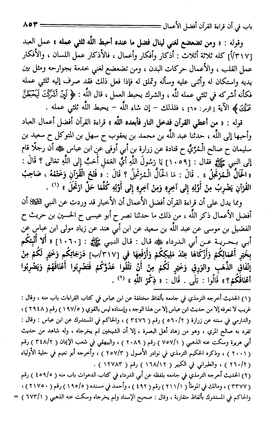 1060 - حدثنا نصر، حدثنا أبو عيسى، حدثنا الحسين بن حريث، حدثنا الفضيل بن موسى، عن عبد الله بن سعيد، عن ابن أبي هند، عن زياد مولى ابن عباس، عن أبي بحرية، عن أبي الدرداء - رضي الله عنه - قال: قال النبي صلى الله عليه وسلم: " إلا أنبئكم بخير أعمالكم، وأزكاها عند مليككم، وأرفعها في درجاتكم، وخير لكم من إنفاق الذهب والورق، وخيرٌ لكم من أن تلقوا عدوكم، فتضربوا أعناقهم ويضربوا أعناقكم؟ قالوا: بلى، قال: " ذكر الله ".