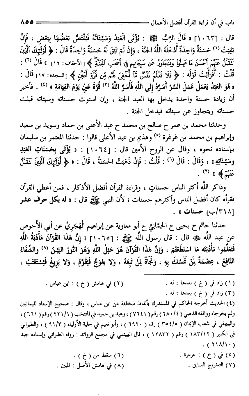 1065 - حدثنا حاتم، حدثنا يحيى، حدثنا الحماني، حدثنا أبو معاوية، عن إبراهيم الهجري، عن أبي الأحوص، عن عبد الله - رضي الله عنه - قال: قال رسول الله صلى الله عليه وسلم: " إن هذا القرآن مأدبة الله تعالى، فتعلموا مأدبته ما استطعتم، وإن هذا القرآن هو حبل الله، وهو النور البين والشفاء النافع، عصمة لمن تمسك به، نجاة لمن تبعه، لا يعوج فيقوَّم، ولا يزيغ فيُستعتب، ولا تنقضي عجائبه، ولا يخلق من كثرة الرد، اتلوه فإن الله يأجركم على تلاوته لكل حرف عشر حسنات، أما إني لا أقول آلم حرف ولكن ألف حرف، ولام حرف، وميم حرفٌ ".