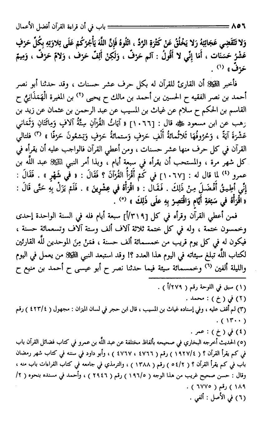 1066 - حدثنا أبو نصر أحمد بن نصر الفقيه، حدثنا الحسين بن أحمد بن مالك، حدثنا يحيى بن المغيرة الهمذاني، حدثنا القاسم بن الحكم، حدثنا سلام، عن غياث بن المسيب، عن عبد الرحمن بن عثمان، عن زيد بن وهب، عن ابن مسعود - رضي الله عنه - قال: " آيات القرآن ستة آلاف ومائتان وثماني عشرة آية، وحروفها ثلاثمائة ألف حرف وستمائة حرف وتسعون حرفاً ".