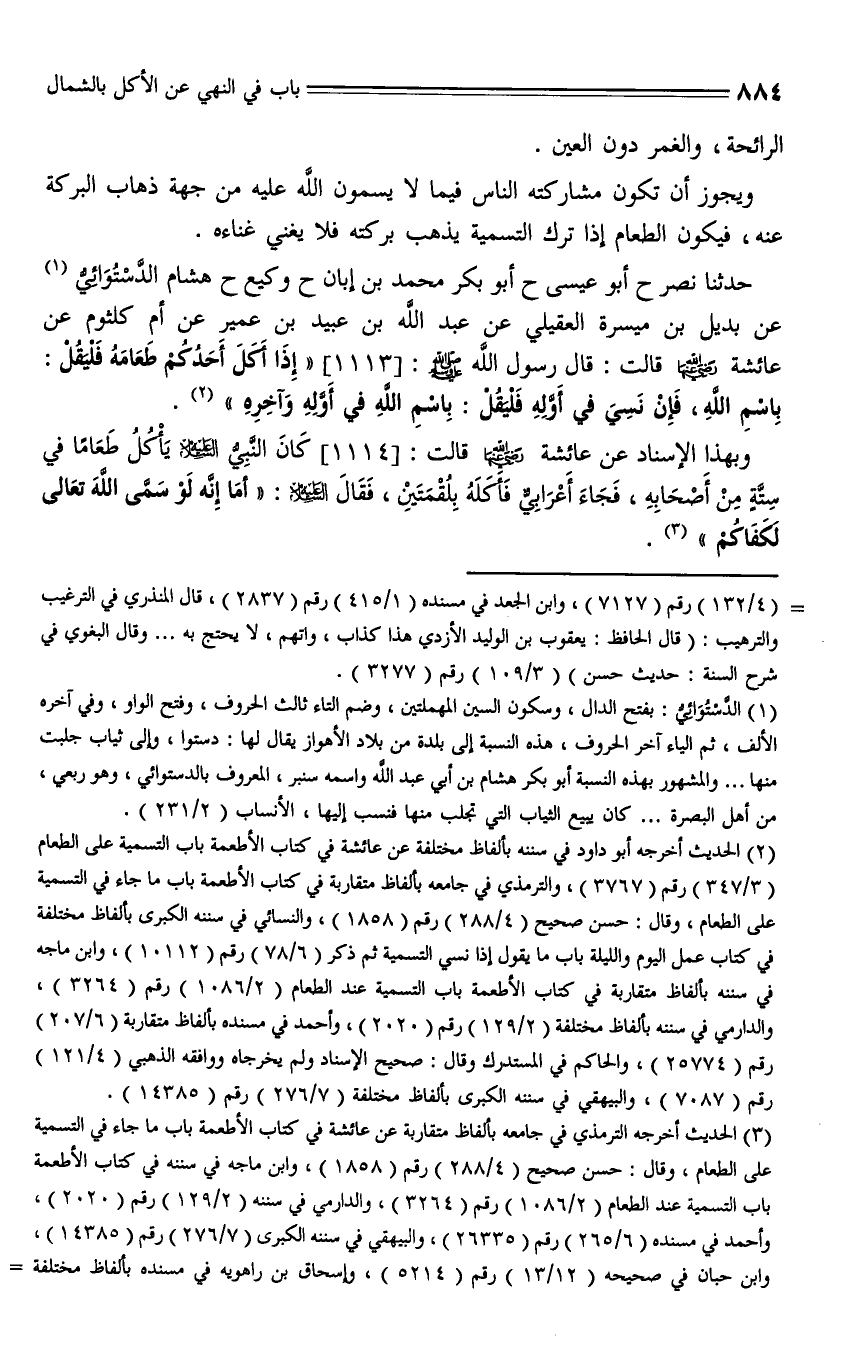 1114 - وبهذا الإسناد عن عائشة، قالت: " كان النبي عليه السلام يأكل طعاما في ستة من أصحابه، فجاء أعرابي فأكله بلقمتين، فقال - عليه السلام -: أما أنه لو سمى الله لكفاكم ".