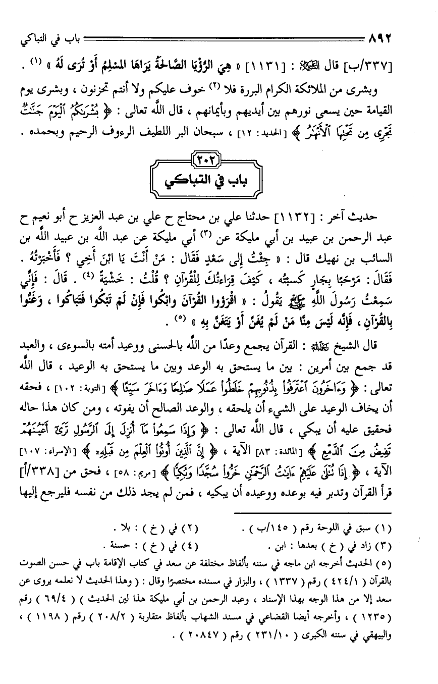 1132 - حدثنا علي بن محتاج، حدثنا علي بن عبد العزيز، حدثنا أبو نعيم، حدثنا عبد الرحمن بن عبيد بن أبي مليكة، عن أبي مليكة، عن عبد الله بن عبيد الله بن السائب بن نهيك، قال: جئت إلى سعد، فقال: من أنت يا ابن أخي؟ فأخبرته، فقال: مرحبا بجار كسبته، كيف قراءتك للقرآن؟ قلت: حسنة (1)، قال: فإني سمعت رسول الله عليه السلام، يقول: " اقرؤوا القرآن وابكوا، فإن لم تبكوا فتباكوا، وغنوا بالقرآن، فإنه ليس منا من لم يُغن أو يتغن به ".