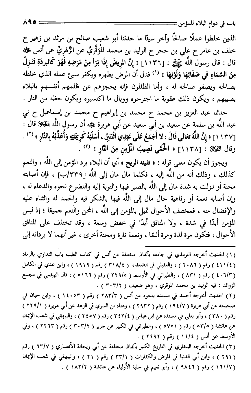 1136 - حدثنا أبو شعيب صالح بن مرثد بن زهير، حدثنا خلف بن عامر، حدثنا علي بن حجر، حدثنا الوليد بن محمد الموقري، عن الزهري، عن أنس - رضي الله عنه - قال: قال رسول الله - صلى الله عليه وسلم -: " إن المريض إذا برأ من مرضه، فهو كالبردة تنزل من السماء في صفاءها ولونها ".