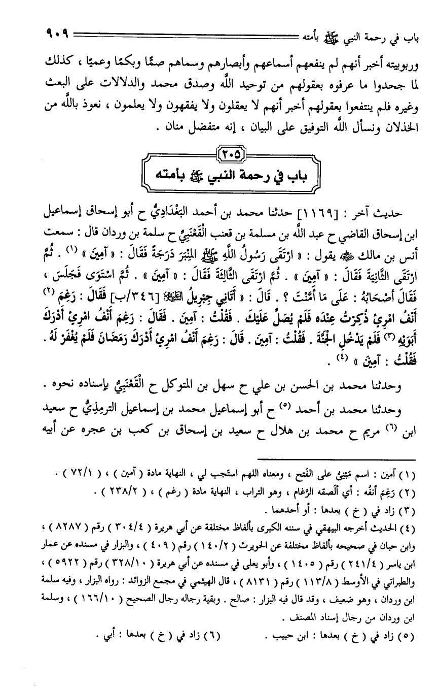 1169 - حدثنا محمد بن أحمد البغدادي، حدثنا أبو إسحاق إسماعيل بن إسحاق القاضي، حدثنا عبد الله بن مسلمة بن قعنب القعنبي، حدثنا سلمة بن وردان، قال: سمعت أنس بن مالك - رضي الله عنه - يقول: " ارتقى رسول الله - صلى الله عليه وسلم - المنبر درجة، فقال: " آمين "، ثم ارتقى الثانية، فقال: " آمين "، ثم ارتقى الثالثة، فقال: " آمين "، ثم استوى فجلس فقال أصحابه: على ما أمّنت؟ قال: " أتاني جبريل - عليه السلام - فقال: رغم أنف امرئ ذُكرت عنده، فلم يصل عليك، فقلت: آمين، قال: رغم أنف امرئ أدرك أبويه فلم يدخل الجنة، فقلت: آمين، قال: رغم أنف امرئ أدرك رمضان فلم يُغفر له، فقلت: آمين ".