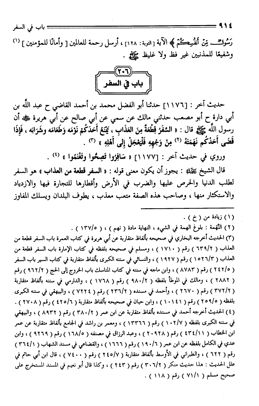 1176 - حدثنا أبو الفضل محمد بن أحمد القاضي، حدثنا عبد الله بن أبي دارة، حدثنا أبو مصعب، حدثني مَالِكٌ، عَنْ سُمَيٍّ، عَنْ أَبِي صَالِحٍ، عَنْ أَبِي هُرَيْرَةَ - رضي الله عنه - أَنَّ رَسُولَ اللهِ - صلى الله عليه وسلم - قَالَ: " السَّفَرُ قِطْعَةٌ مِنَ الْعَذَابِ، يَمْنَعُ أَحَدَكُمْ نَوْمَهُ وَطَعَامَهُ وَشَرَابَهُ، فَإِذَا قَضَى أَحَدُكُمْ نَهْمَتَهُ مِنْ وَجْهِهِ، فَلْيُعَجِّلْ إِلَى أَهْلِهِ ".